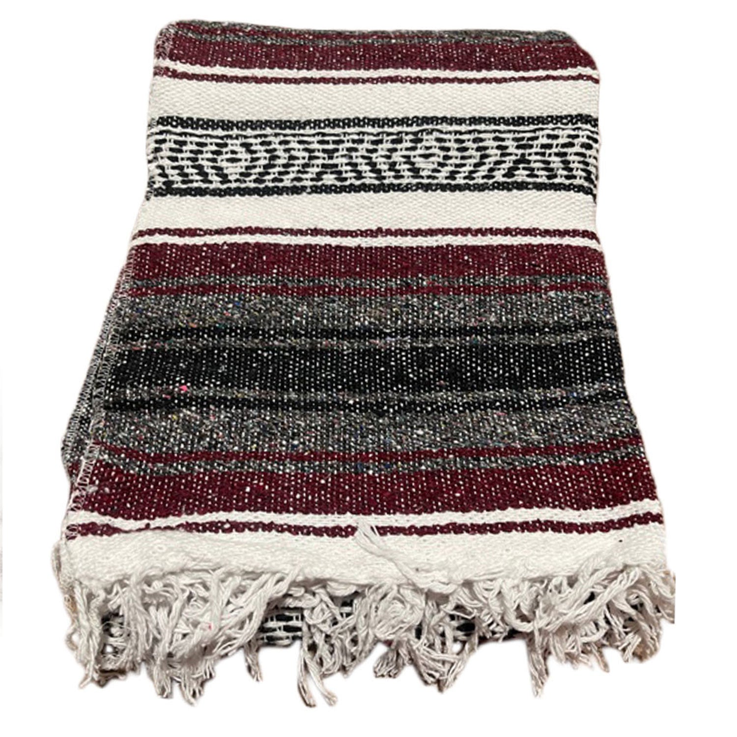 A versatile Western favorite, this classic falsa blanket blends practicality with bold style. Featuring fringe along the edges and a striking stripe pattern in pink, white, black, and gray tones, it makes a great accent piece for both indoor and outdoor settings. Perfect for yoga, picnics, camping, or sporting events, it’s as functional as it is eye-catching. Available in assorted colors including Fuchsia Pink, Maroon/Burgundy, Turquoise, and Navy Blue.