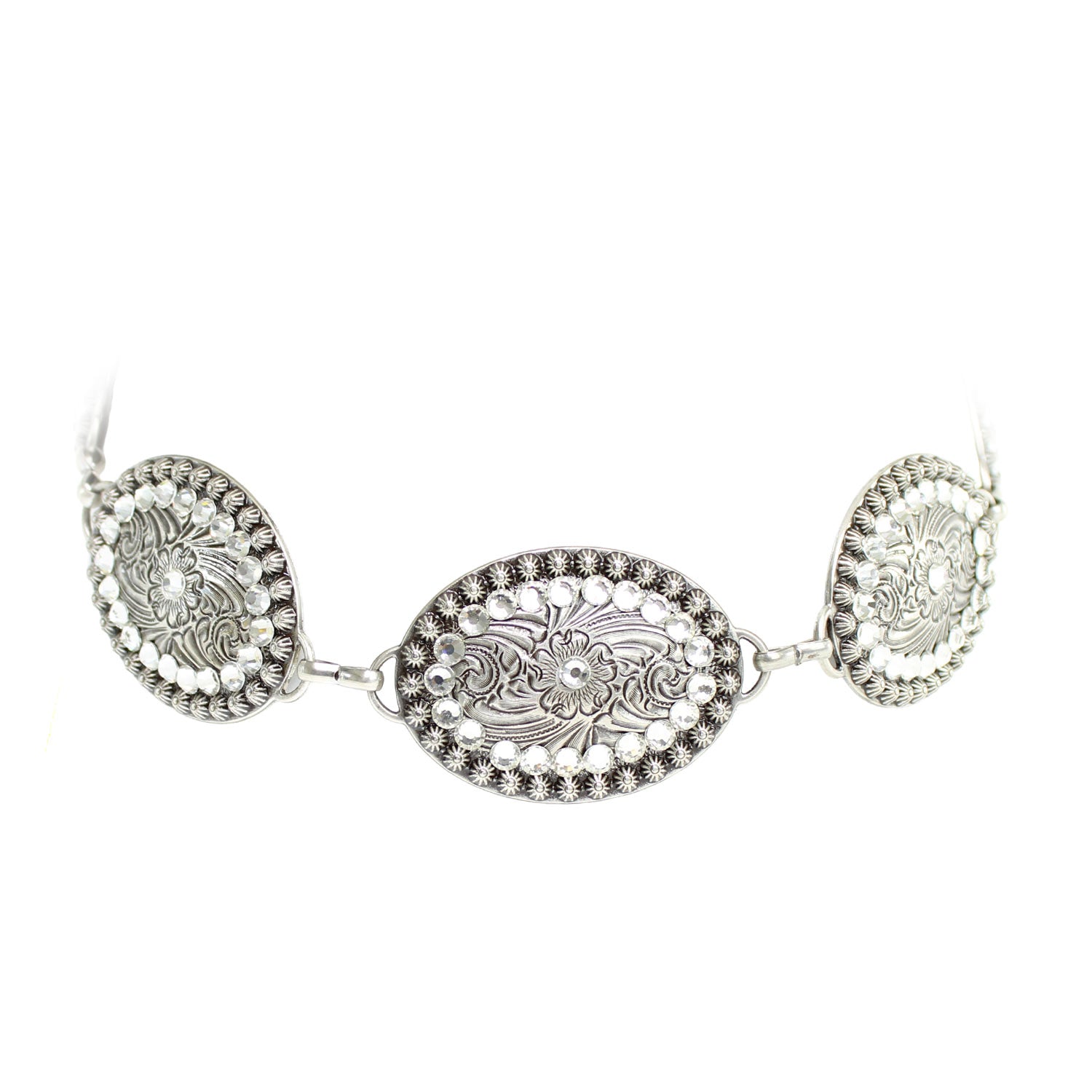 •Design: Oval floral conchos accented with crystals and chain detailing
