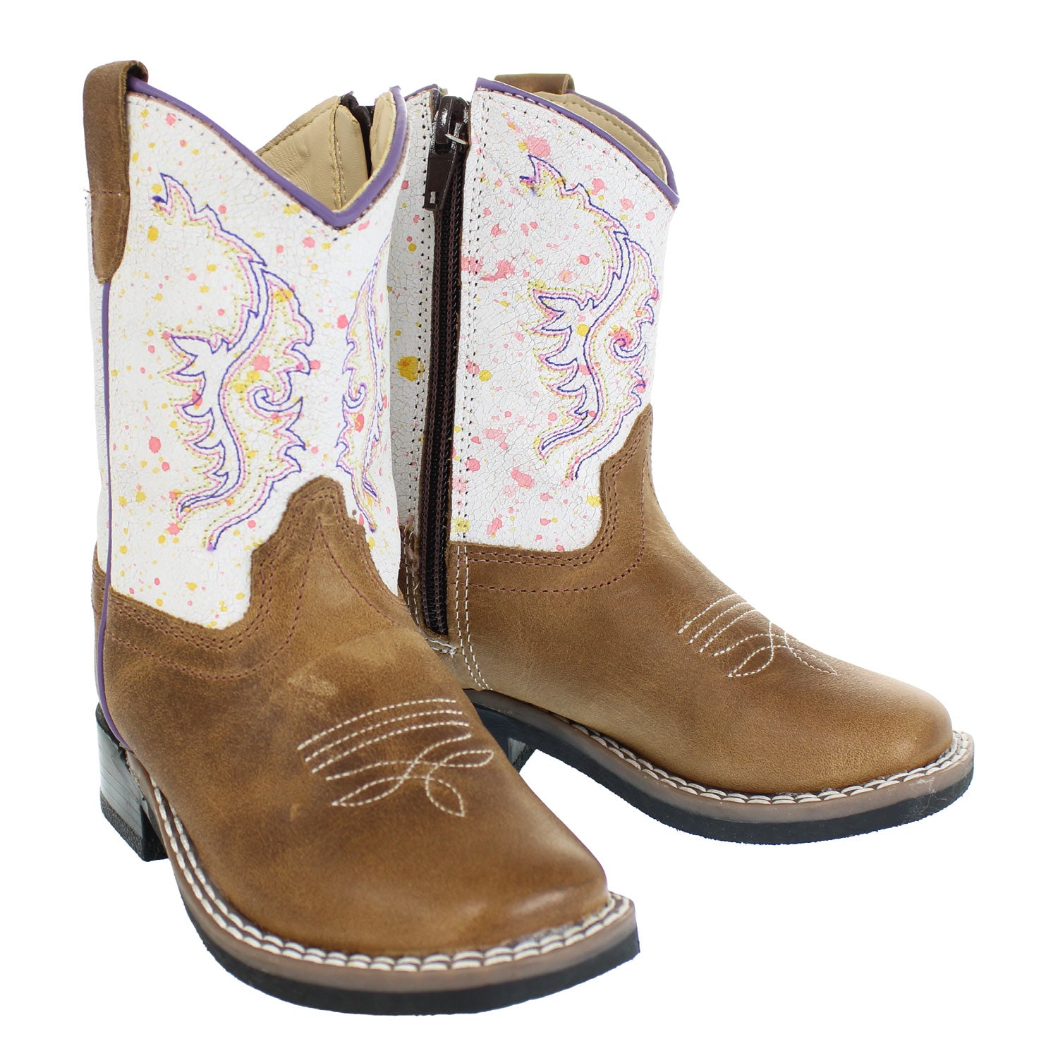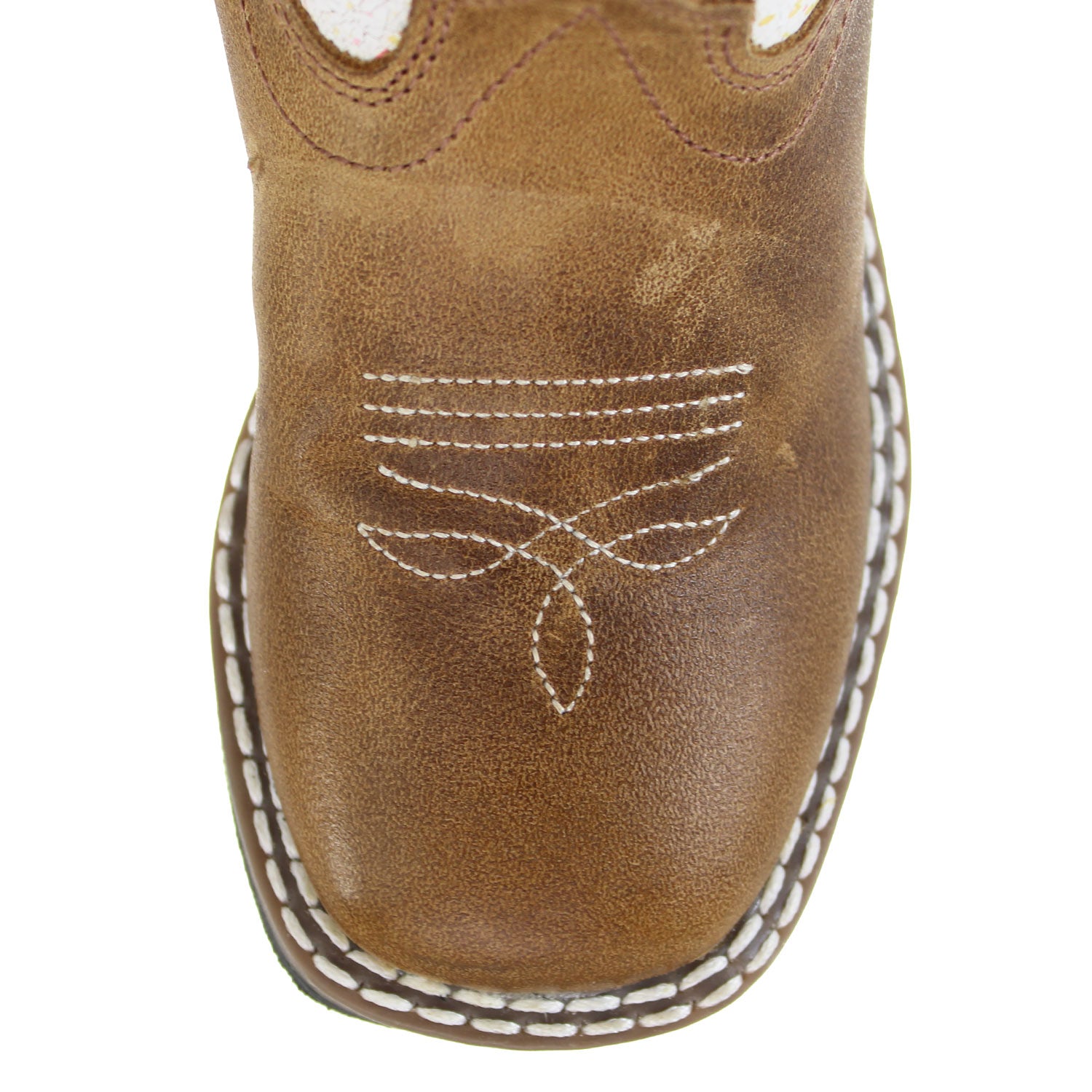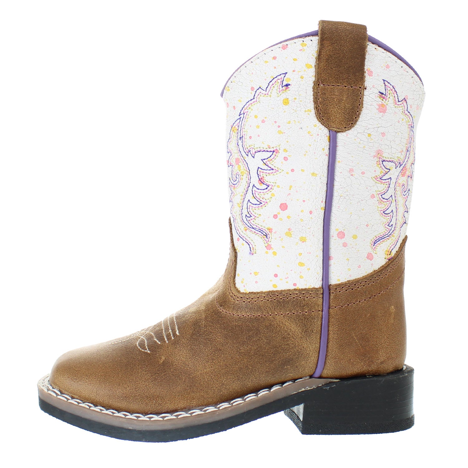 Bright, bold, and built for play! These toddler boots mix a soft tan leather foot with a striking white shaft, decorated with colorful stitching for extra charm. With their comfy fit and sturdy rubber sole (featuring a fun orange lightning bolt), she’ll be ready to stomp, twirl, and explore in style.