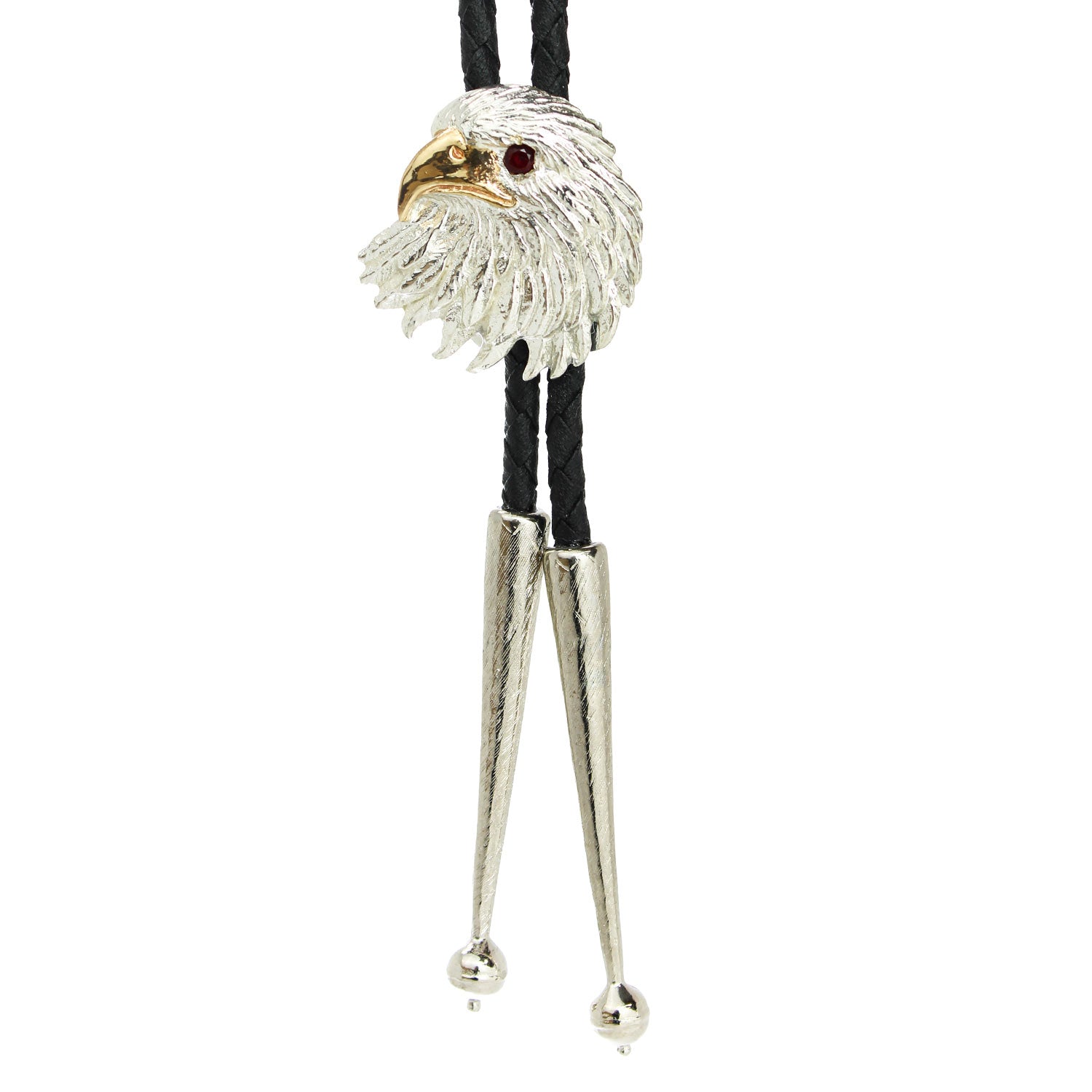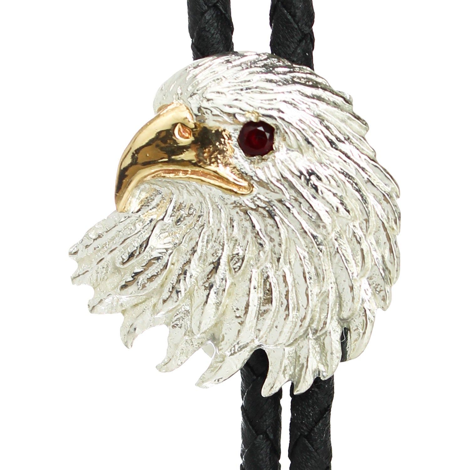 Eagle Head Bolo TieMake a bold Western statement with this Crumrine eagle head bolo tie, featuring a textured silver-toned eagle head design accented with a striking red stone eye and a gold-toned beak. Paired with a black braided leather cord and finished with silver tips, this piece delivers powerful detail and classic Western character.