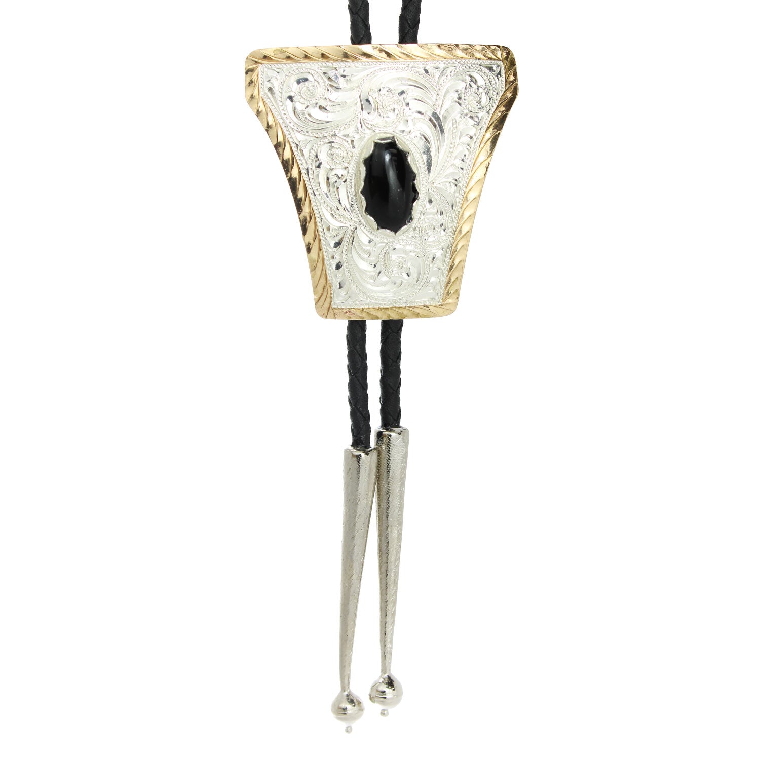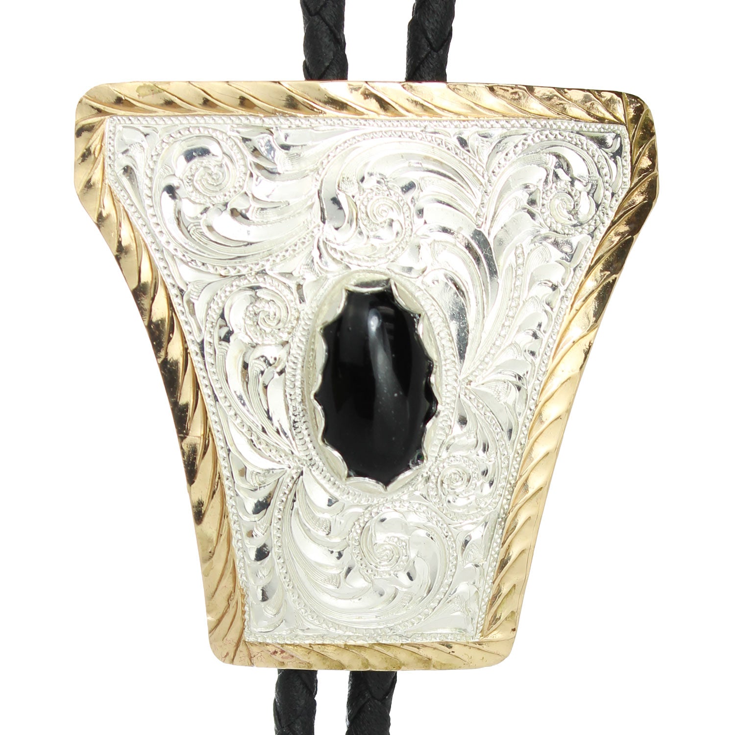 Trapezoid Bolo Tie with Gold Rope EdgeElevate your cowboy style with this classic Crumrine bolo tie, featuring a shiny silver quadrilateral engraved with a timeless Western design. The concho is outlined with a glistening gold rope edge and paired with a sleek black braided cord for a polished, traditional look.