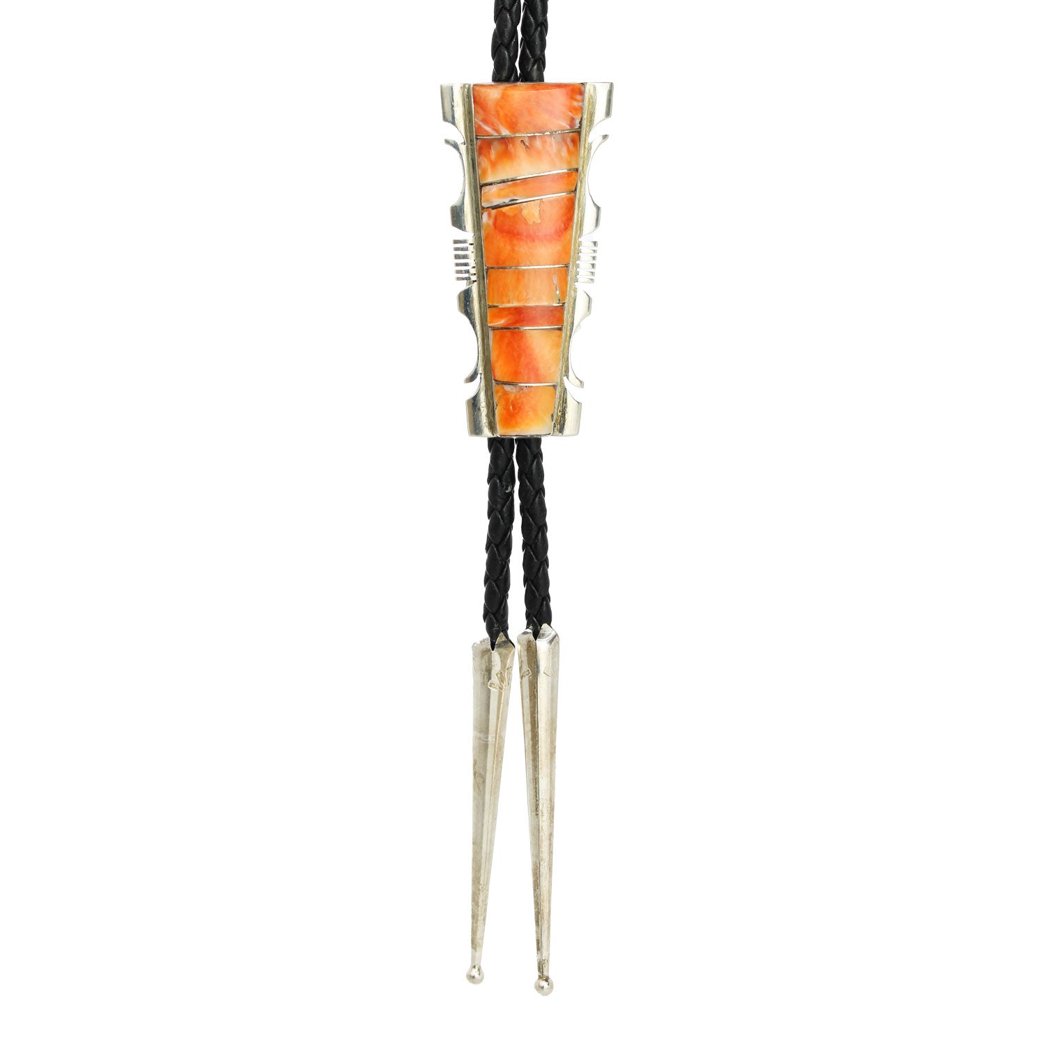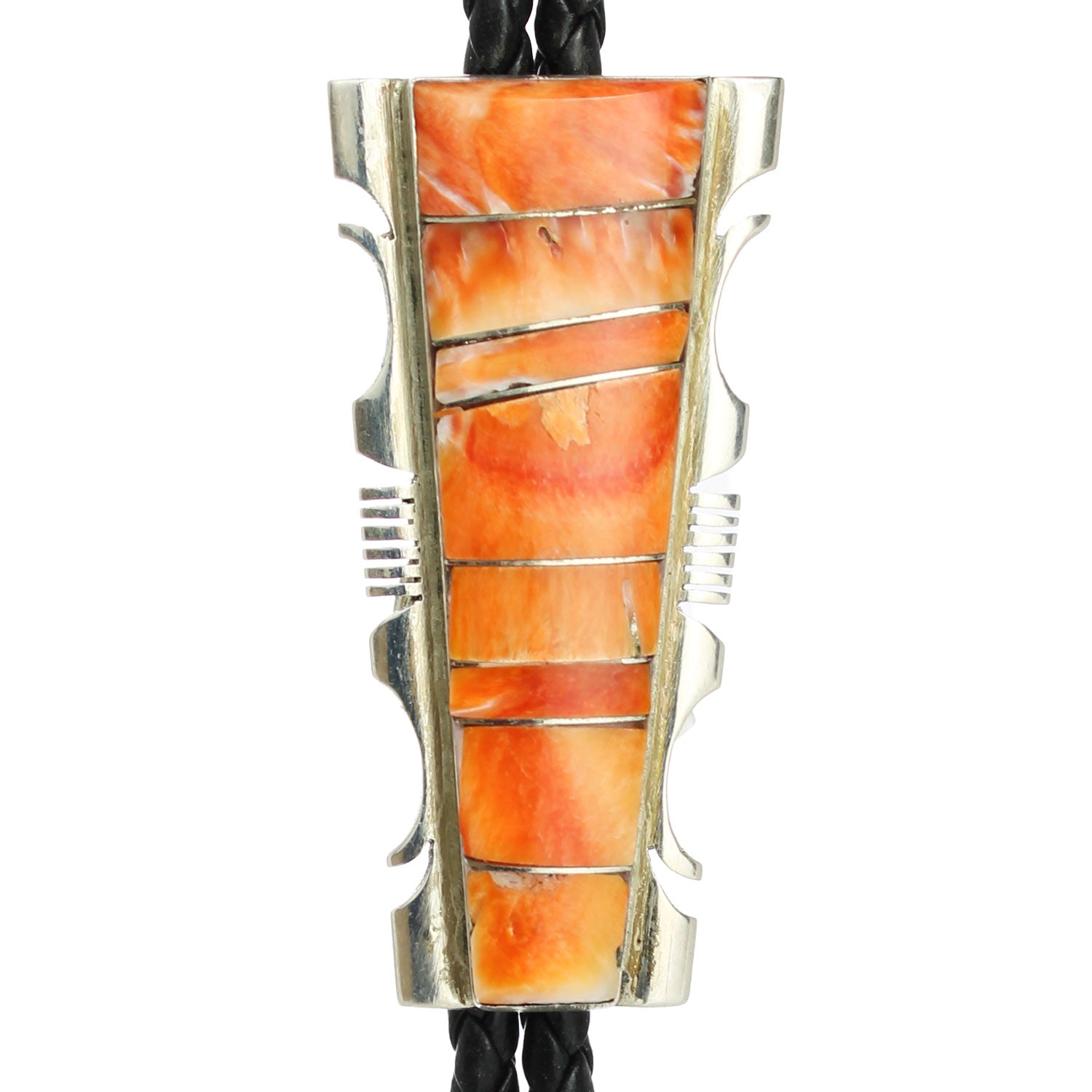 Spiny Oyster Inlay Bolo TieA bold blend of traditional materials and contemporary design, this Al Zuni bolo tie features a vibrant spiny oyster shell inlay set into a sleek silver-toned slide. Bright orange and white shell segments are arranged in horizontal stripes with thin metal dividers, creating a striking, modern look. Finished with a black braided leather cord, this piece stands out as a true statement accessory.
