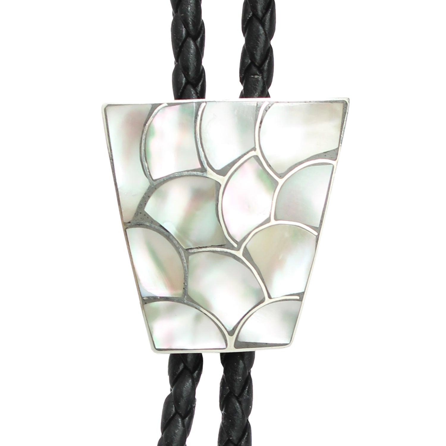 Crafted by Zuni artist Lynelle Johnson, this elegant bolo tie features shimmering mother of pearl inlaid in sterling silver. The geometric fan-shaped slide showcases overlapping inlays in a fluid, scalloped “fish scale” pattern that beautifully catches the light, highlighting the precision and artistry of traditional Zuni mosaic work. Finished with a black braided leather cord and silver tips, it’s a sophisticated Southwestern accessory for both formal and casual occasions.