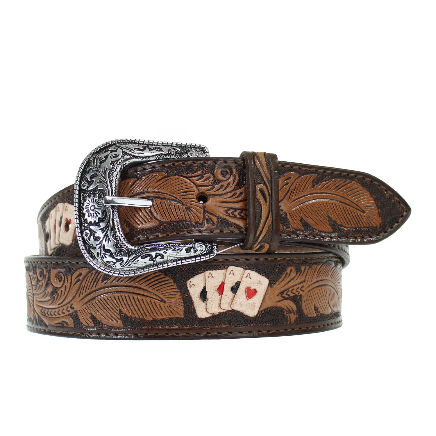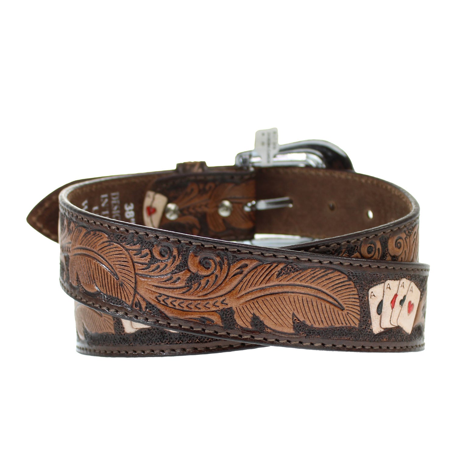 214 Brown Cards Leather BeltShow off your Western flair with this bold leather belt featuring a deck of cards motif and classic silver-tone buckle.