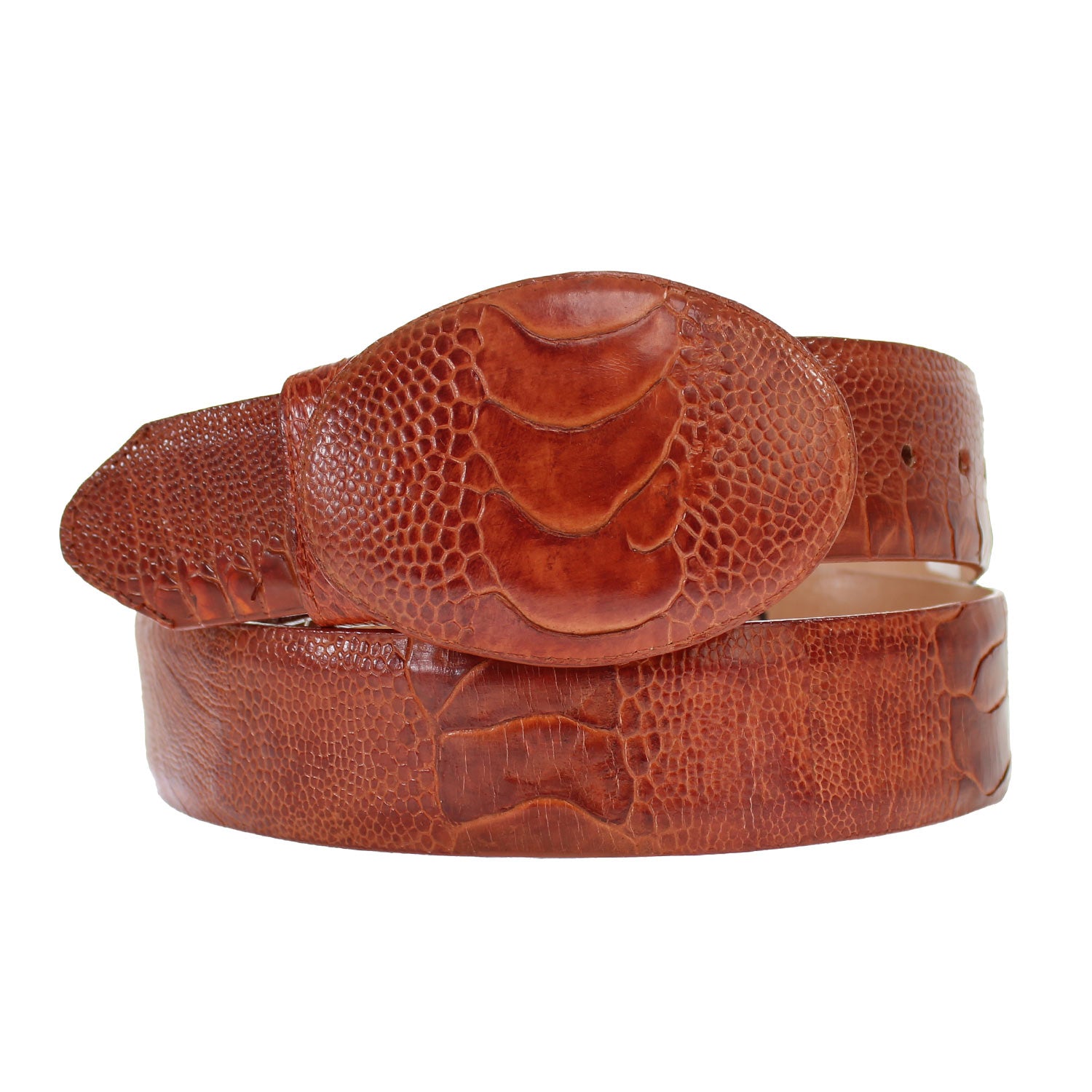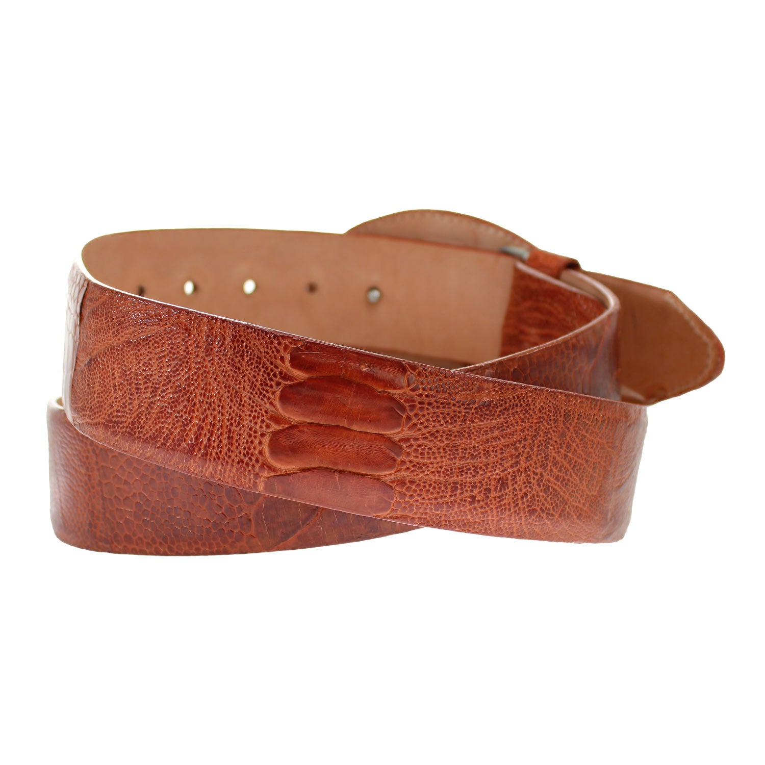 Men’s Ostrich Leg Cowboy BeltHandcrafted from premium genuine ostrich leg leather, this belt combines rugged Western character with refined luxury. Its distinctive texture and rich cognac color make it the perfect match for cowboy boots or elevated casual wear.
