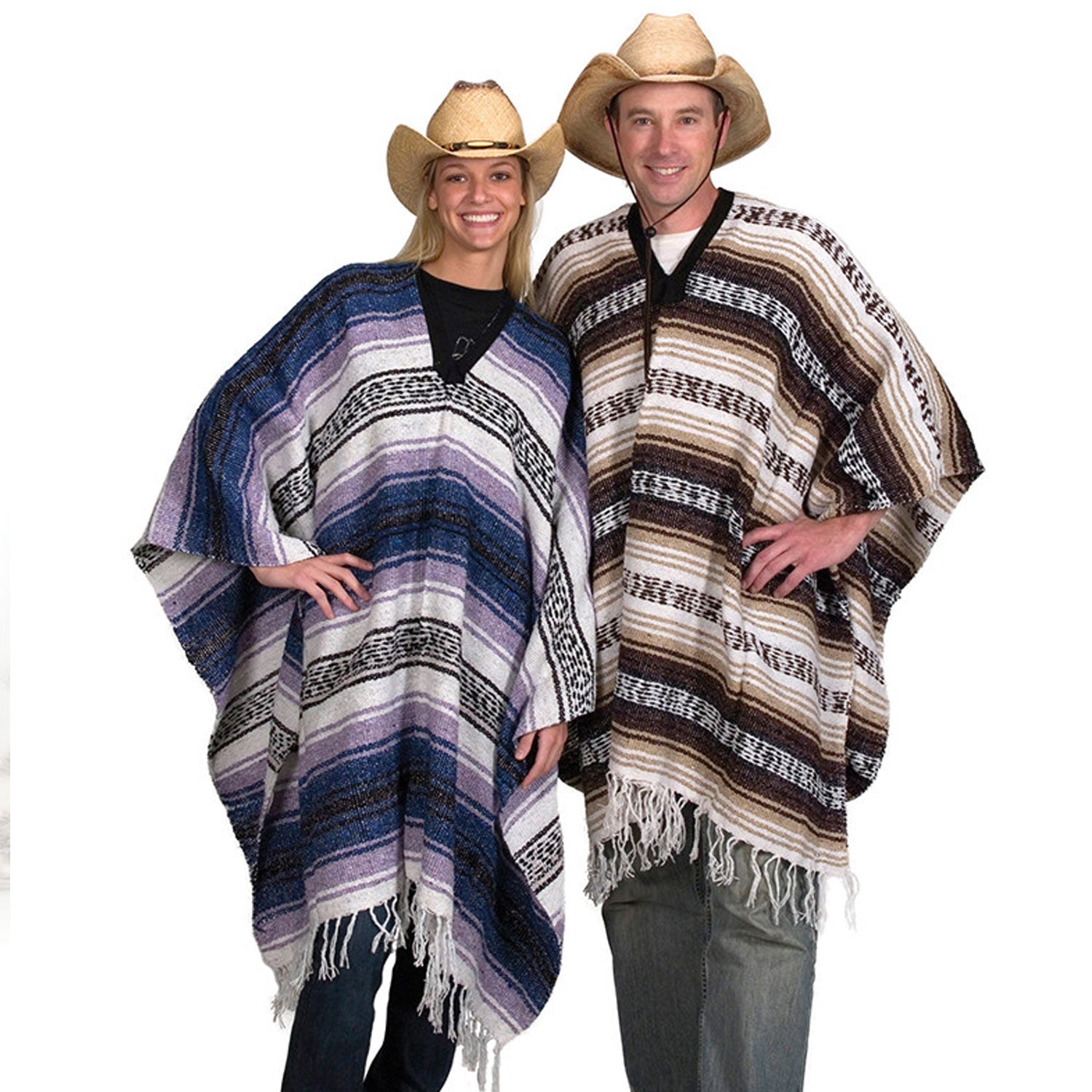 Hand Woven Falsa Style Poncho – Assorted ColorsInspired by the bold patterns of classic falsa blankets, this hand woven pullover poncho delivers timeless Western comfort and style. Designed with a relaxed V-neck, vibrant striped pattern, and fringed ends, it’s the perfect cozy layer for rodeos, sporting events, camping trips, or cool evenings outdoors. Colors may vary, making each piece uniquely eye-catching.