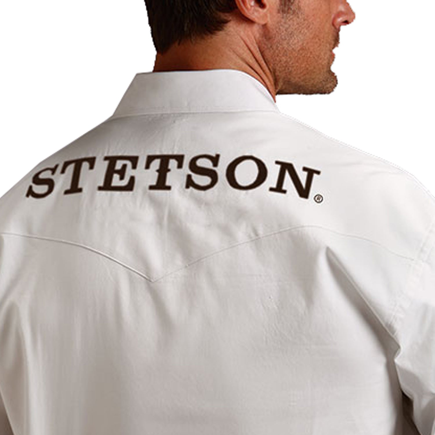 • Brown “Stetson” embroidery on right arm, left collar, and back yoke
