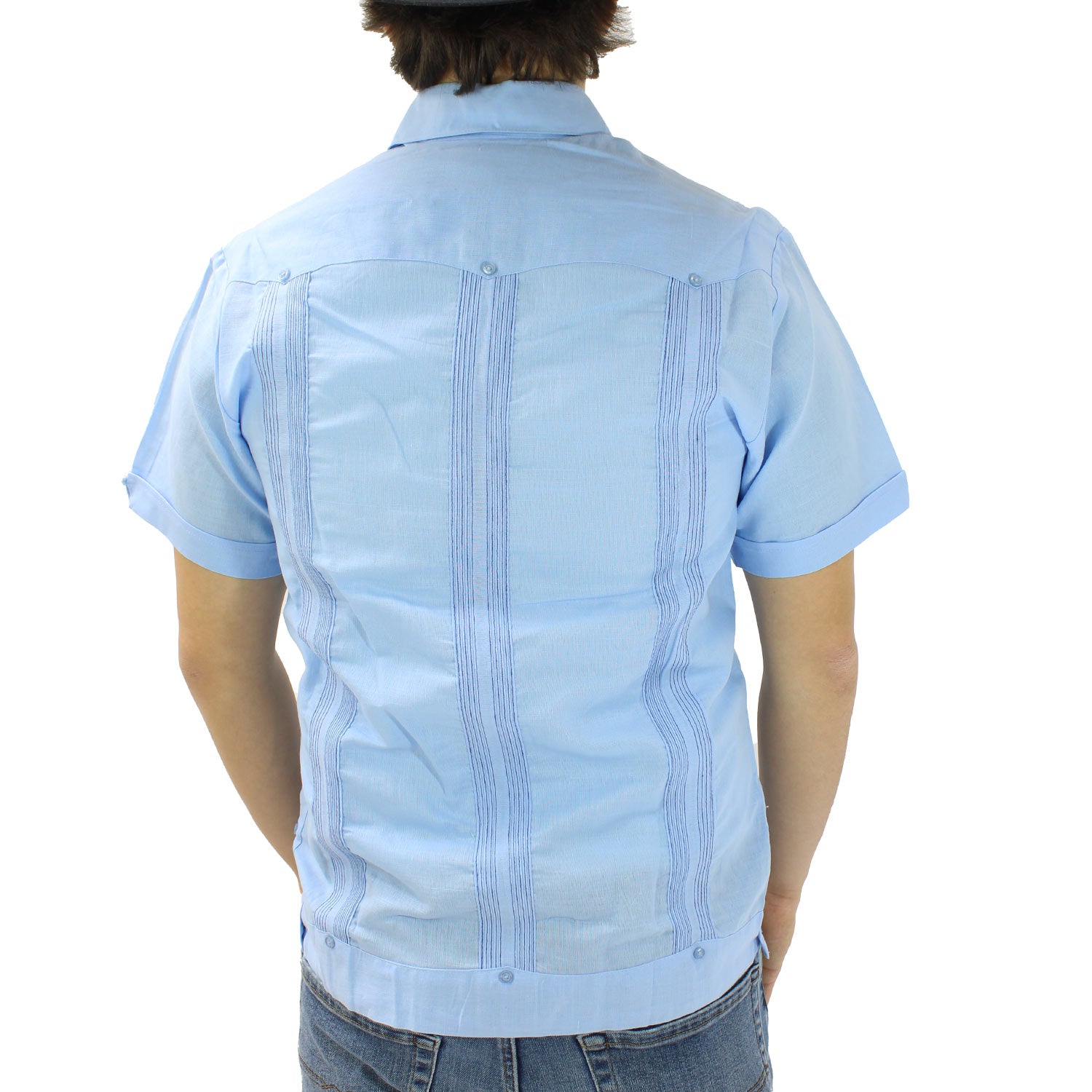 S1745 Sky GuayaberaA classic expression of Latin-inspired style, this short-sleeve guayabera combines traditional craftsmanship with easy modern comfort. Designed with elegant pleats on the front and back and four functional pockets, it’s a versatile choice for warm-weather events, casual outings, or everyday wear.