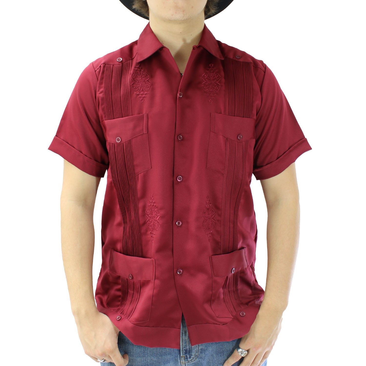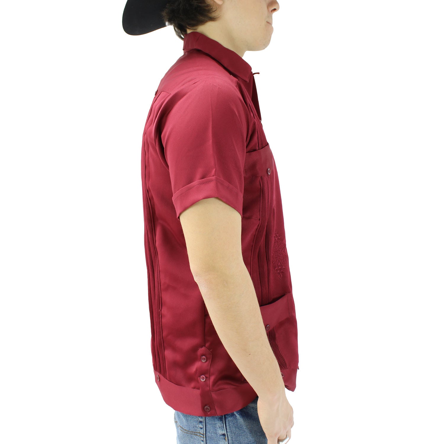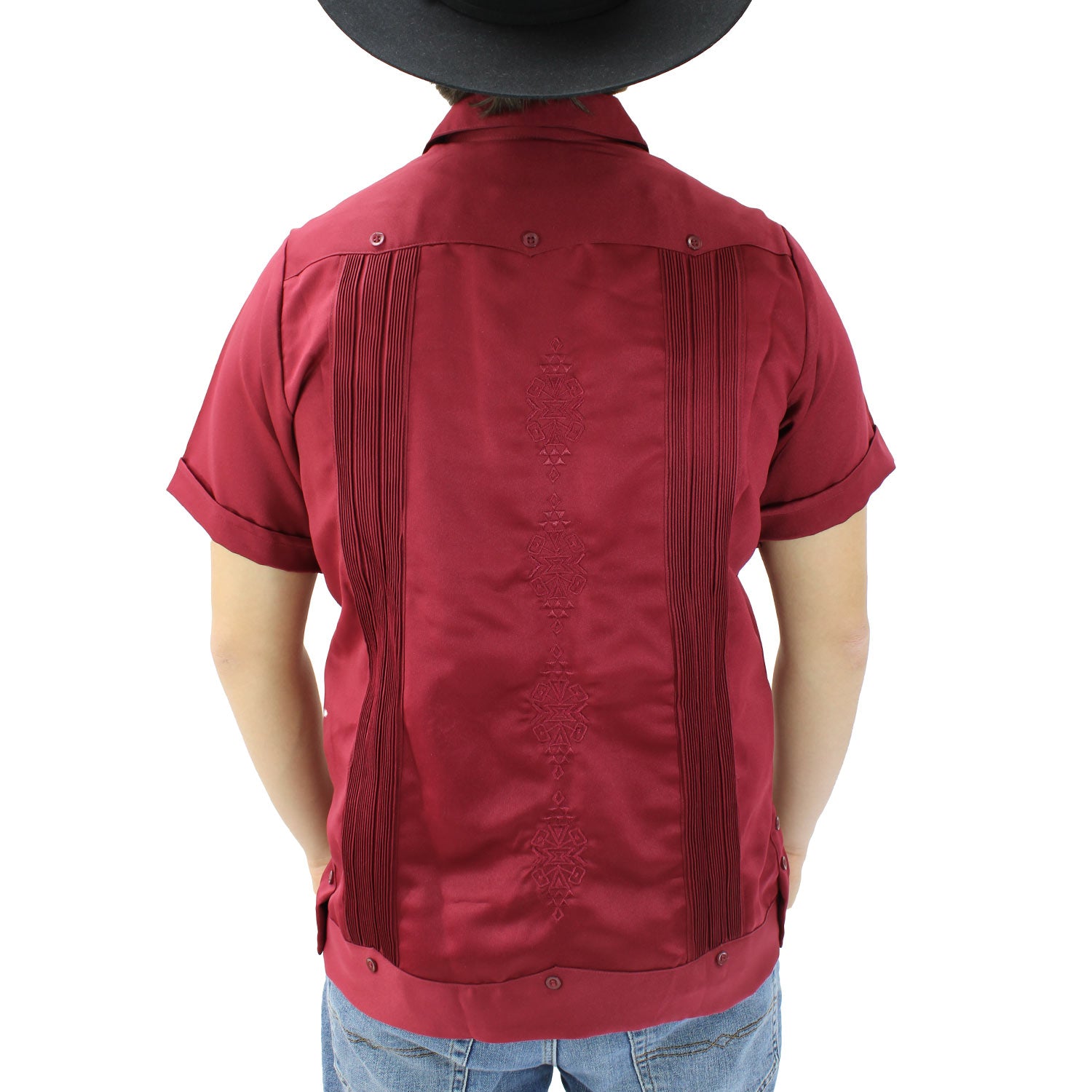 Wine GuayaberaA classic short-sleeve guayabera designed for warm-weather comfort and timeless style. Crafted from a soft, lightweight fabric, it features traditional tonal embroidery, four front button pockets, and a relaxed camp collar—perfect for casual outings, special events, or everyday wear.