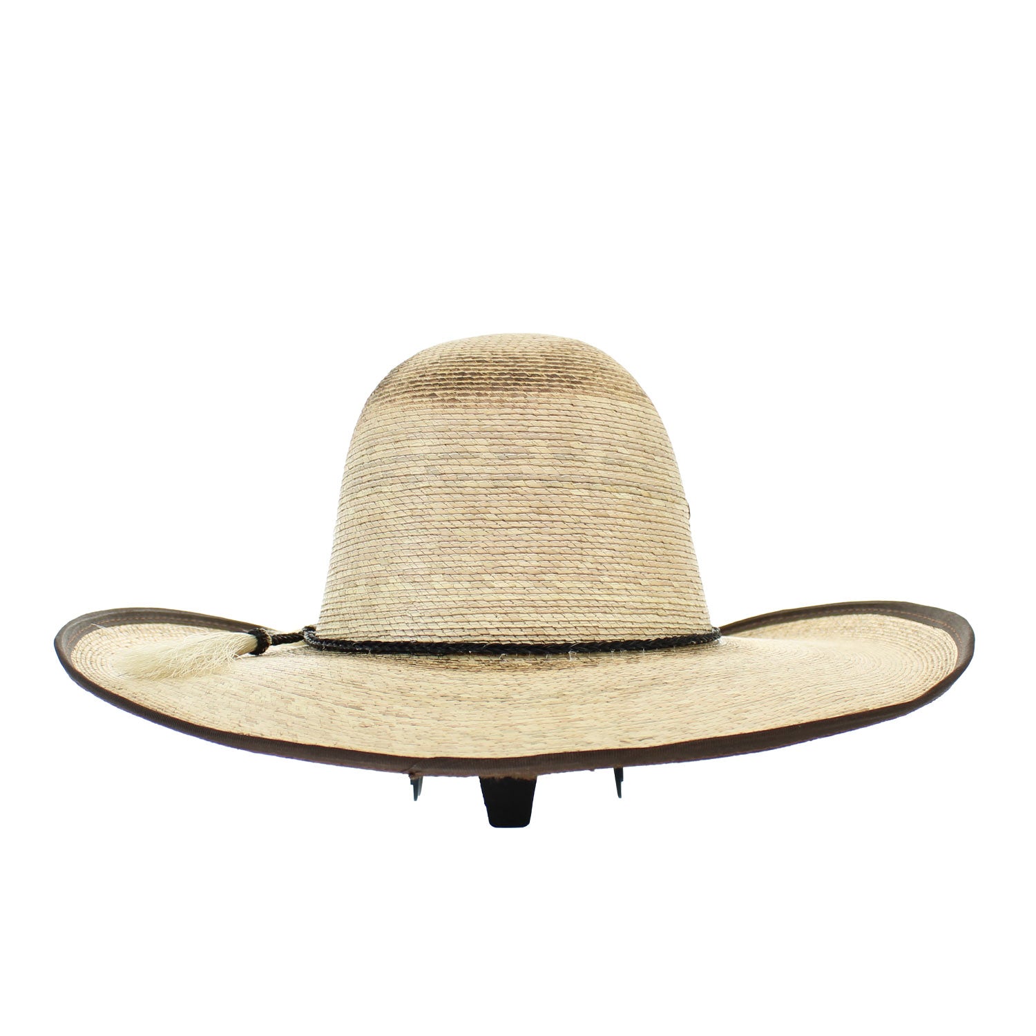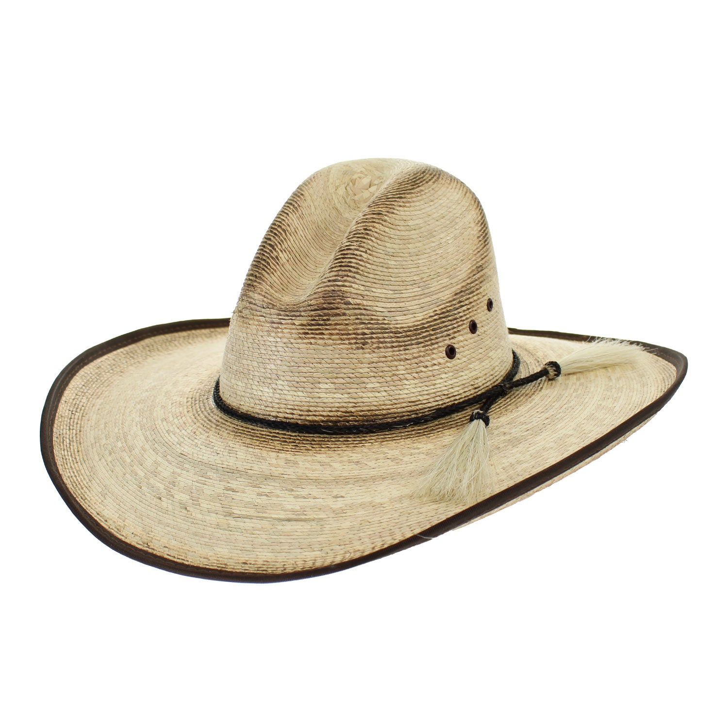 DiegoA rugged natural straw Western hat with a tall Gus crown and wide brim, designed for both sun protection and authentic cowboy style. Finished with a simple black cord hatband accented by horsehair tassels, vented crown eyelets, and a dark bound edge for a bold contrast.