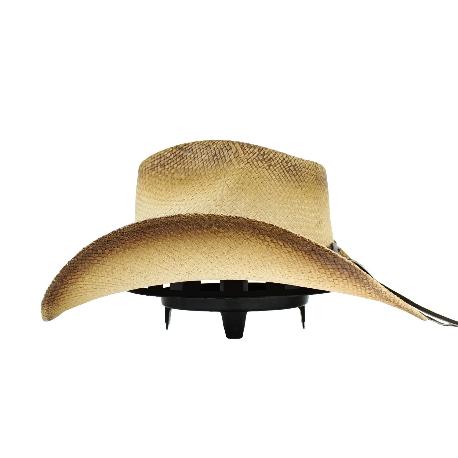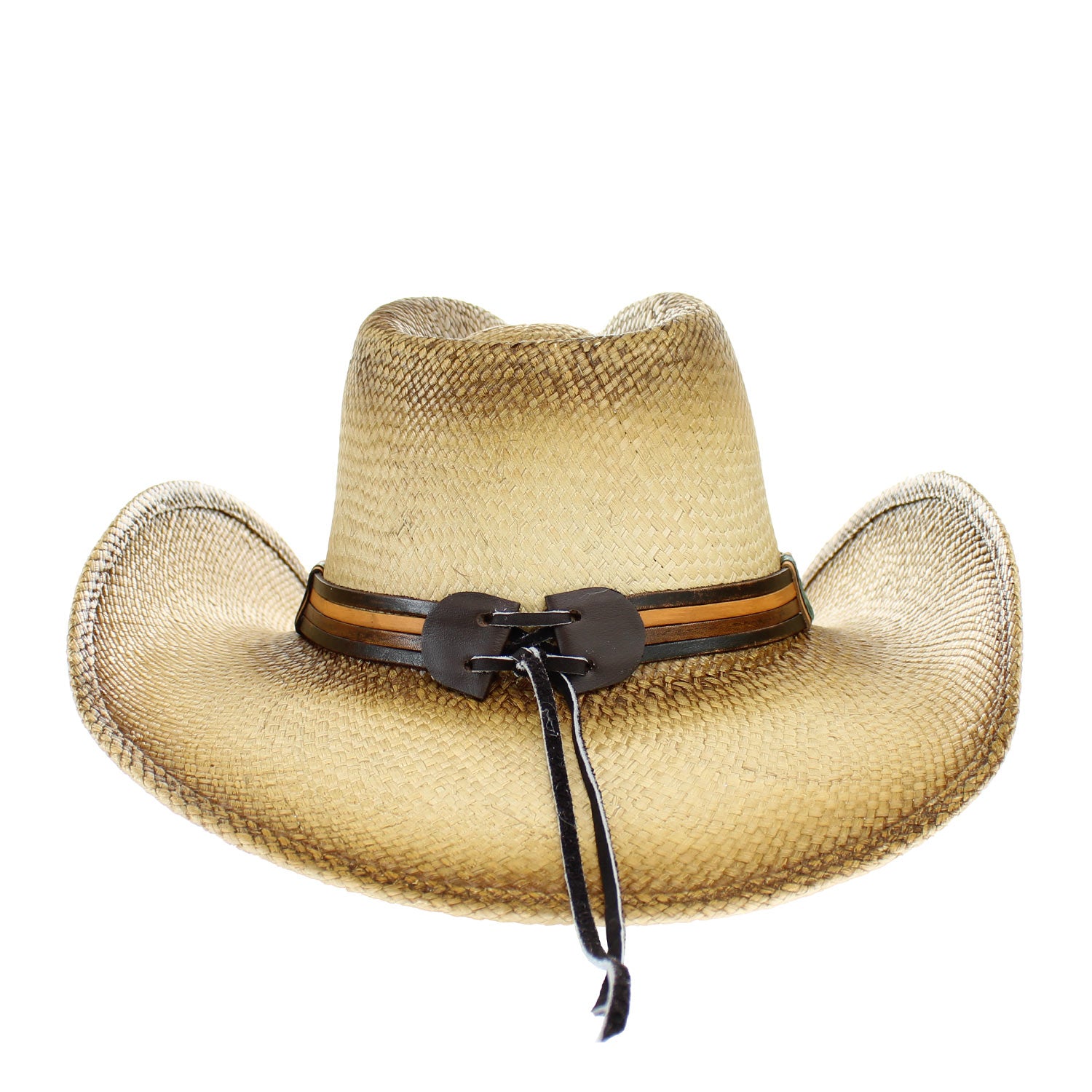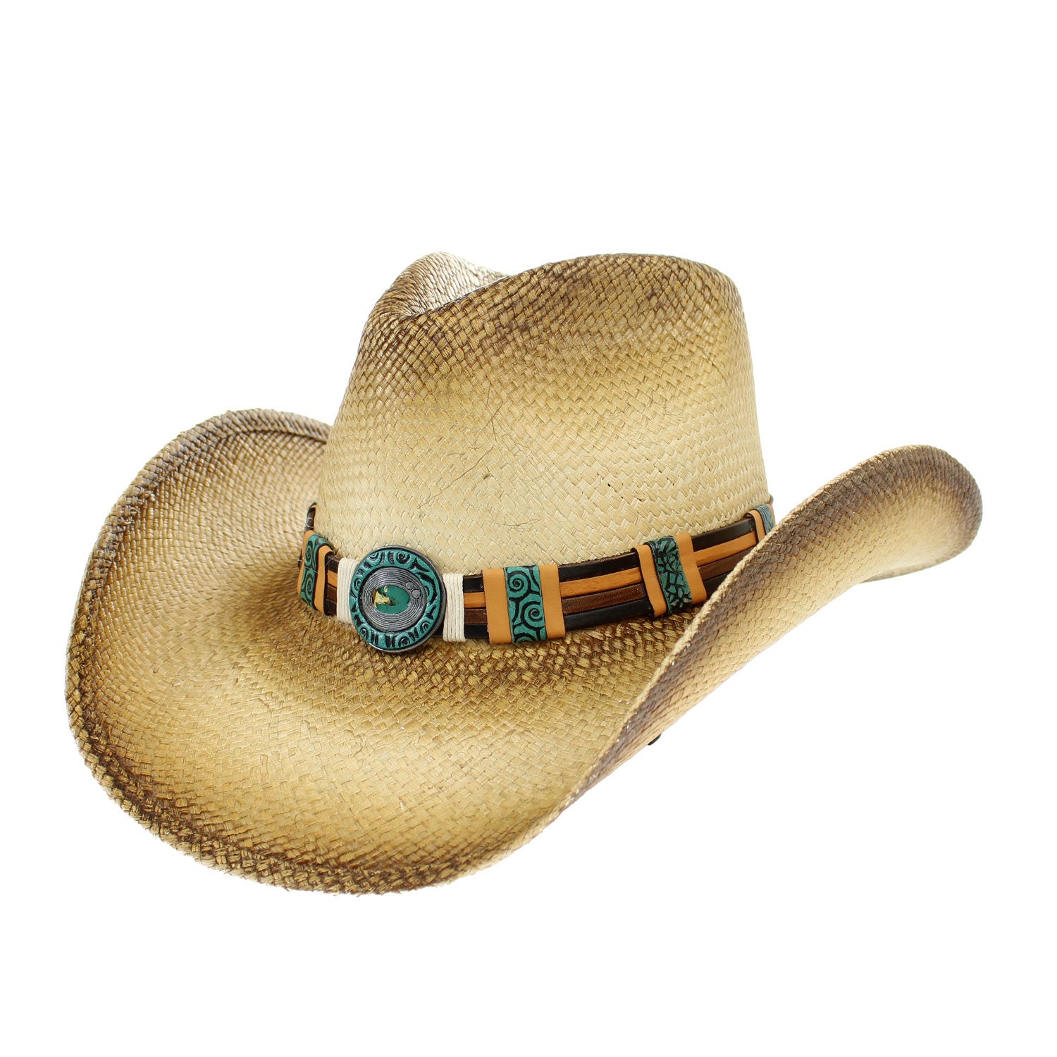 ARKANSAS Straw HatTea-stained pinched front Panama hat featuring a leather hatband and turquoise concho for a classic Western look with a touch of elegance.