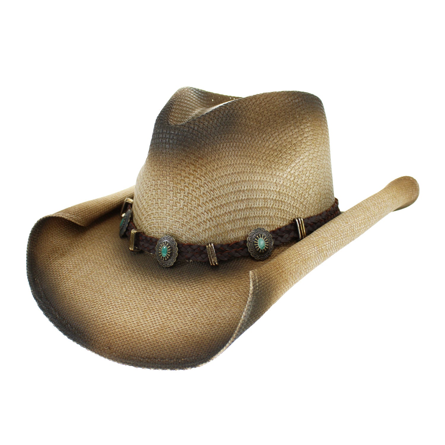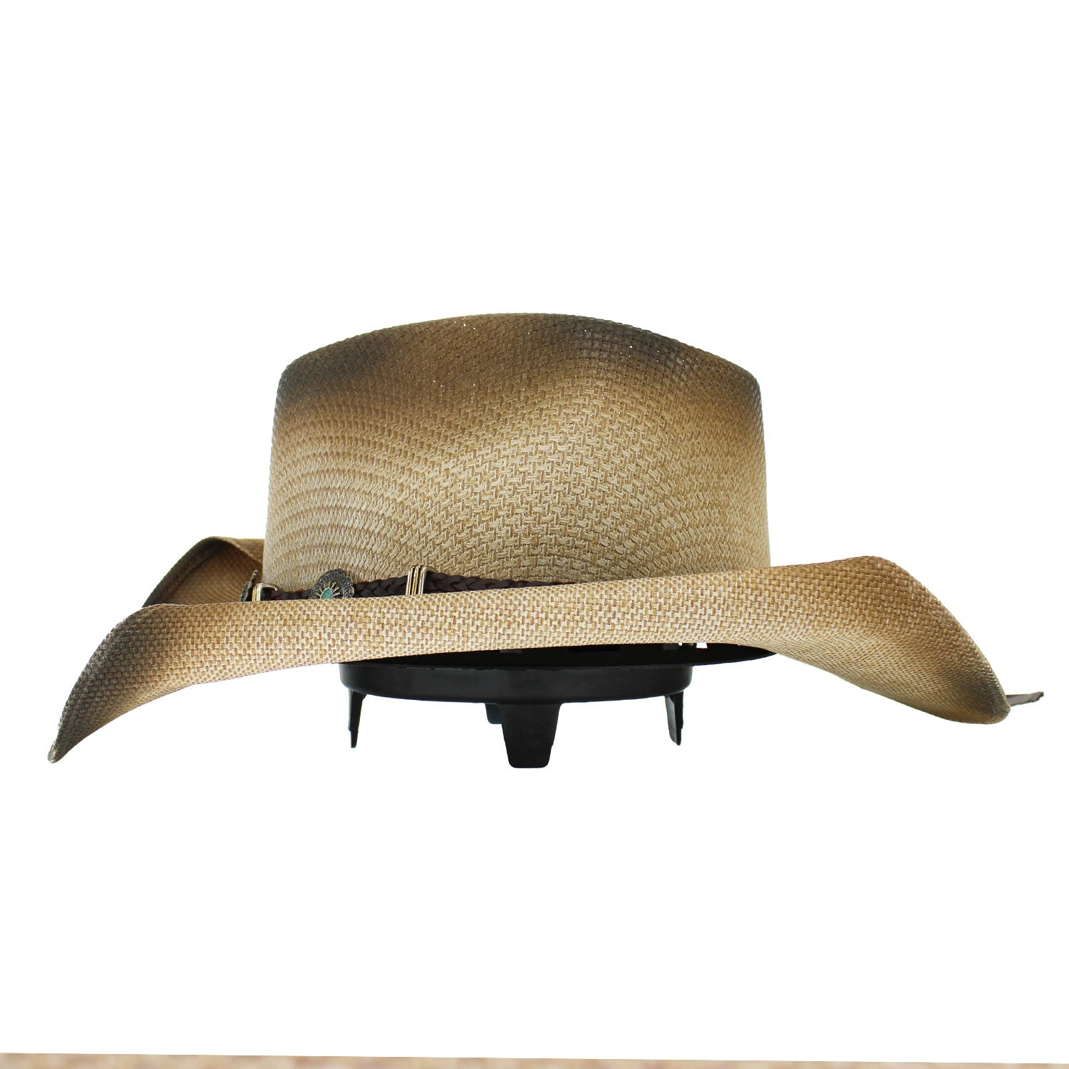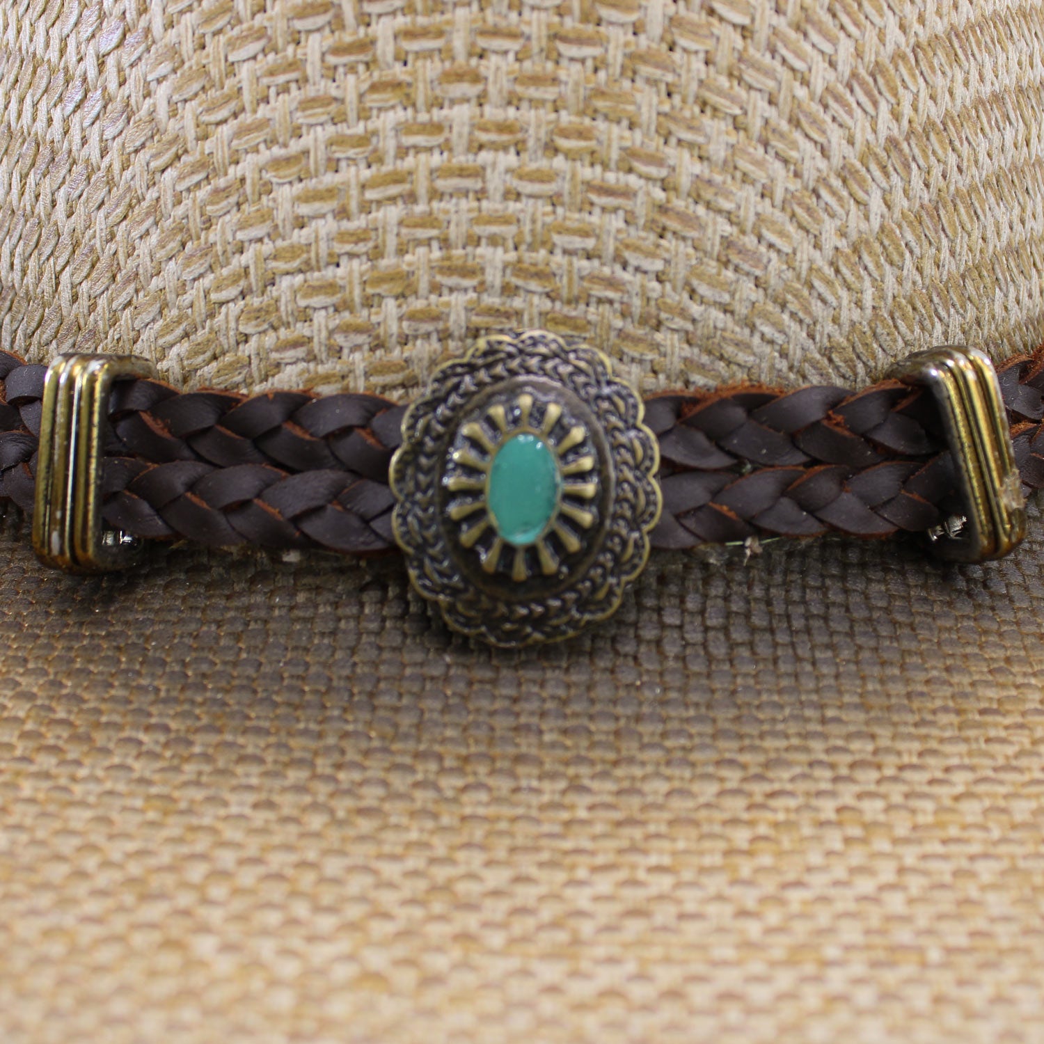 RIVERTextile straw pinched front hat with a 4 1/8" crown, 3 ¾" brim, braided hatband with turquoise accents, and stained straw details for a refined Western style.