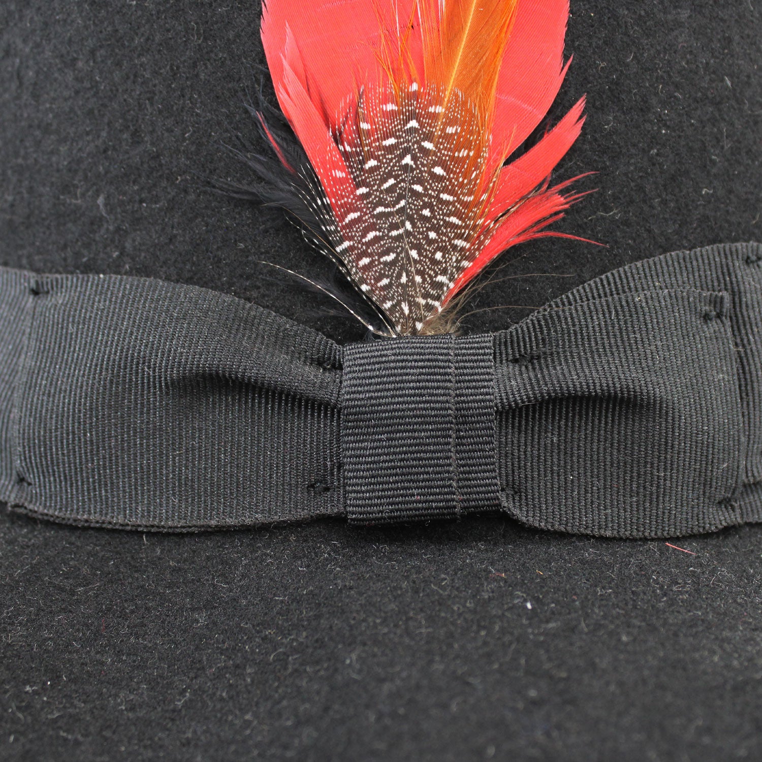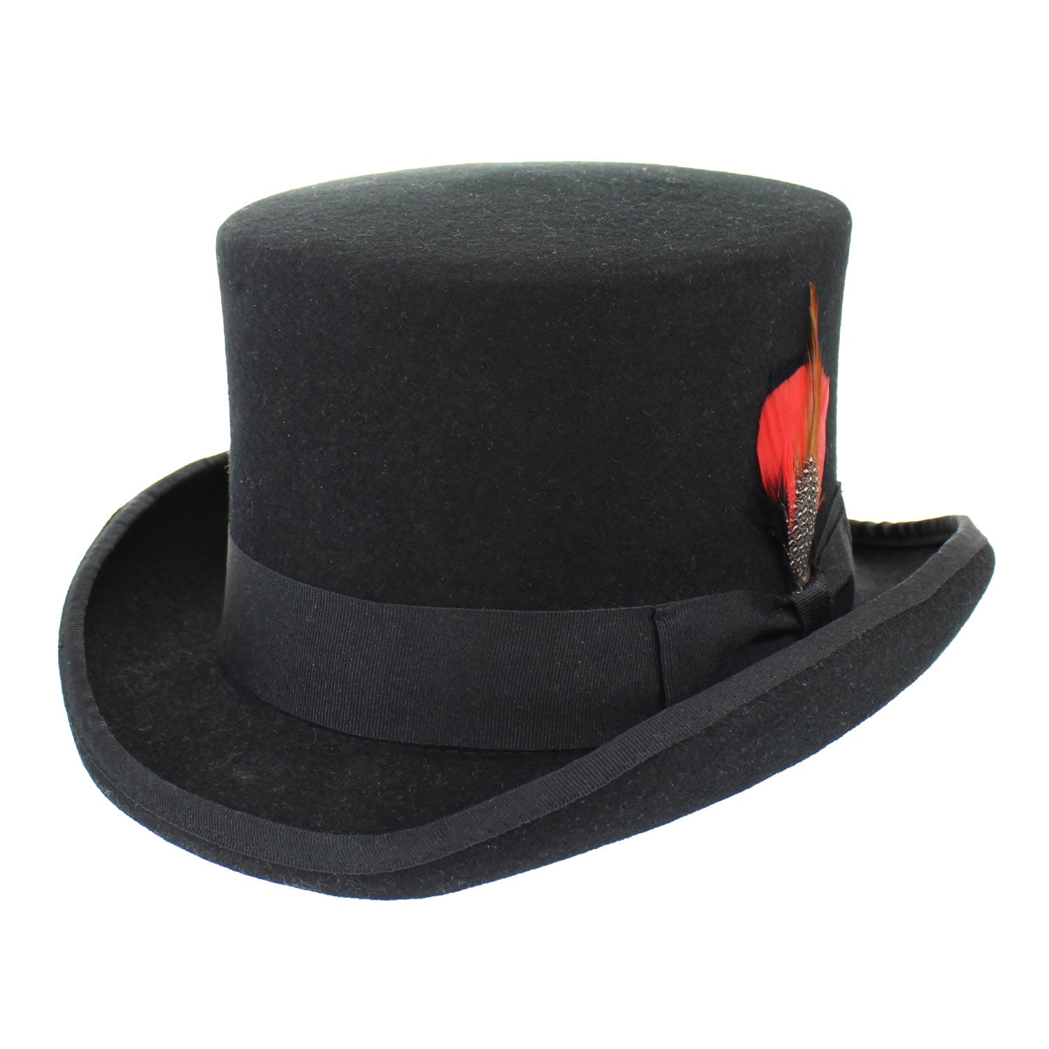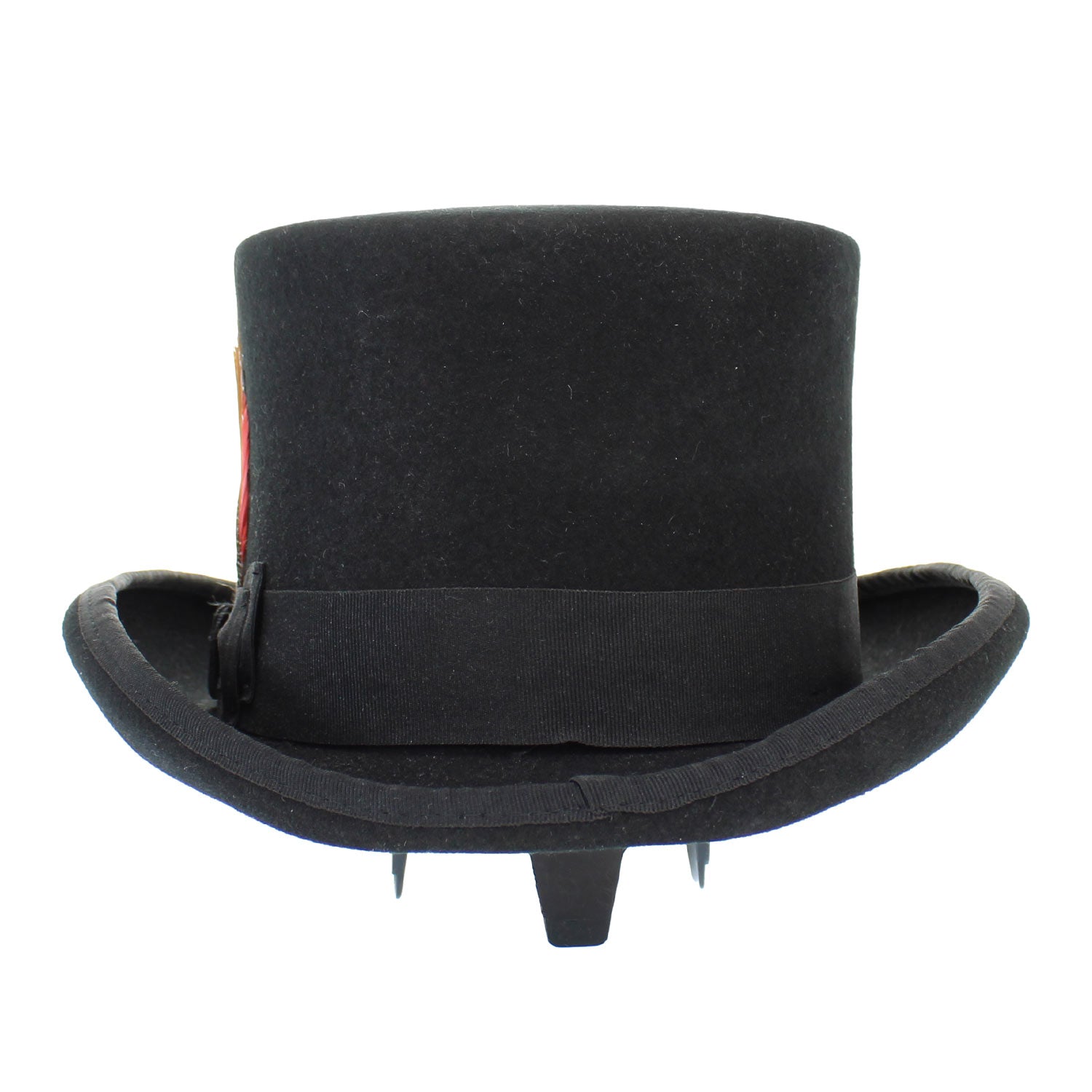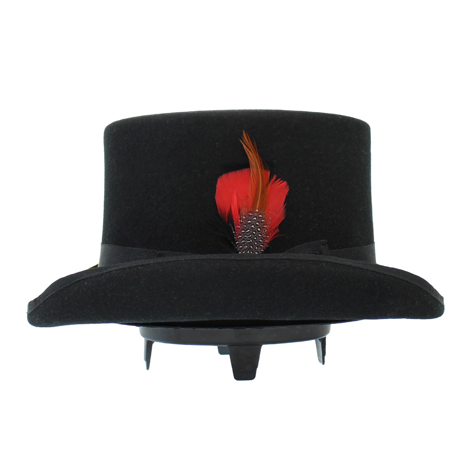 Majestic | Men’s Wool Top Hat with Carriage Hat BandA timeless symbol of sophistication, the Majestic Top Hat is crafted from lightweight wool felt for a refined look and comfortable wear. Featuring a tall 5” crown and a 2” bound brim, this top hat delivers striking presence with every detail. A grosgrain ribbon hatband adorned with red-dotted feathers adds a flourish of elegance, while the AHM Velcro sweatband ensures a secure fit for any occasion. Perfect for formal events or bold statement wear.