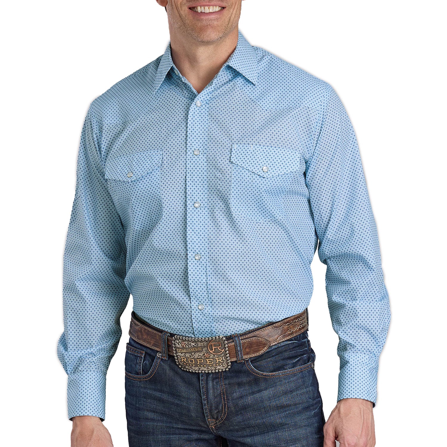• Allover blue mini cross print adds a refined touch to your everyday Western look