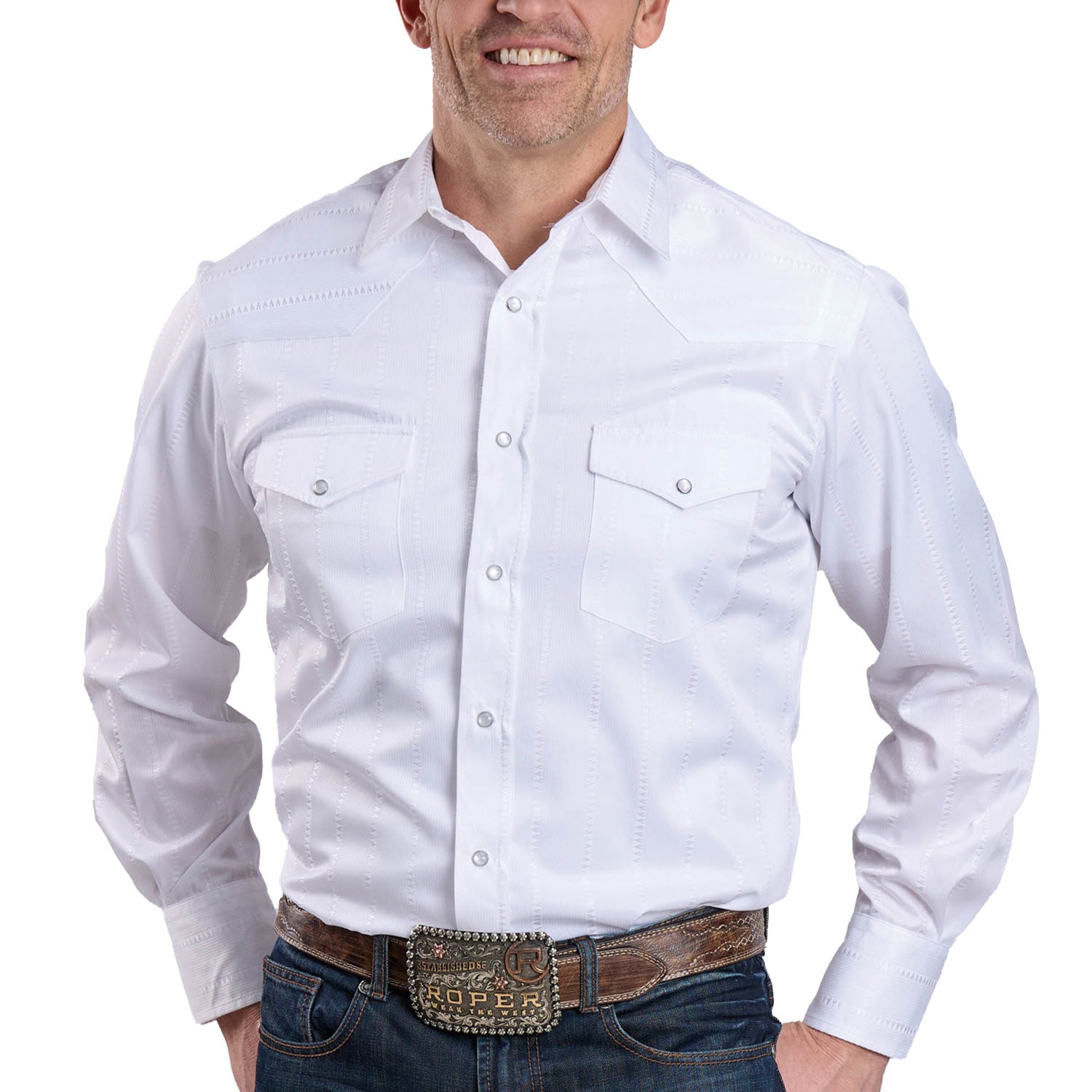 Men's Long Sleeve Western Style Shirt- WHITE STRIPE TONE ON TONE