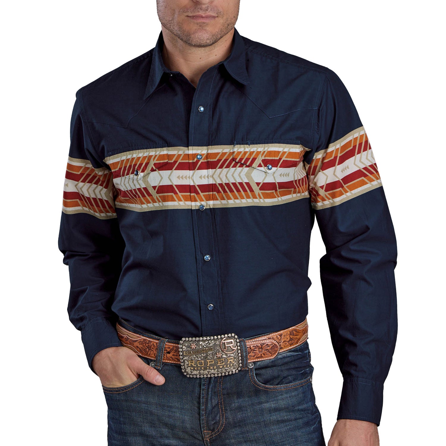 Make a statement with the Roper Men’s Aztec Border Print Shirt — a classic Western look elevated with bold pattern and everyday comfort.