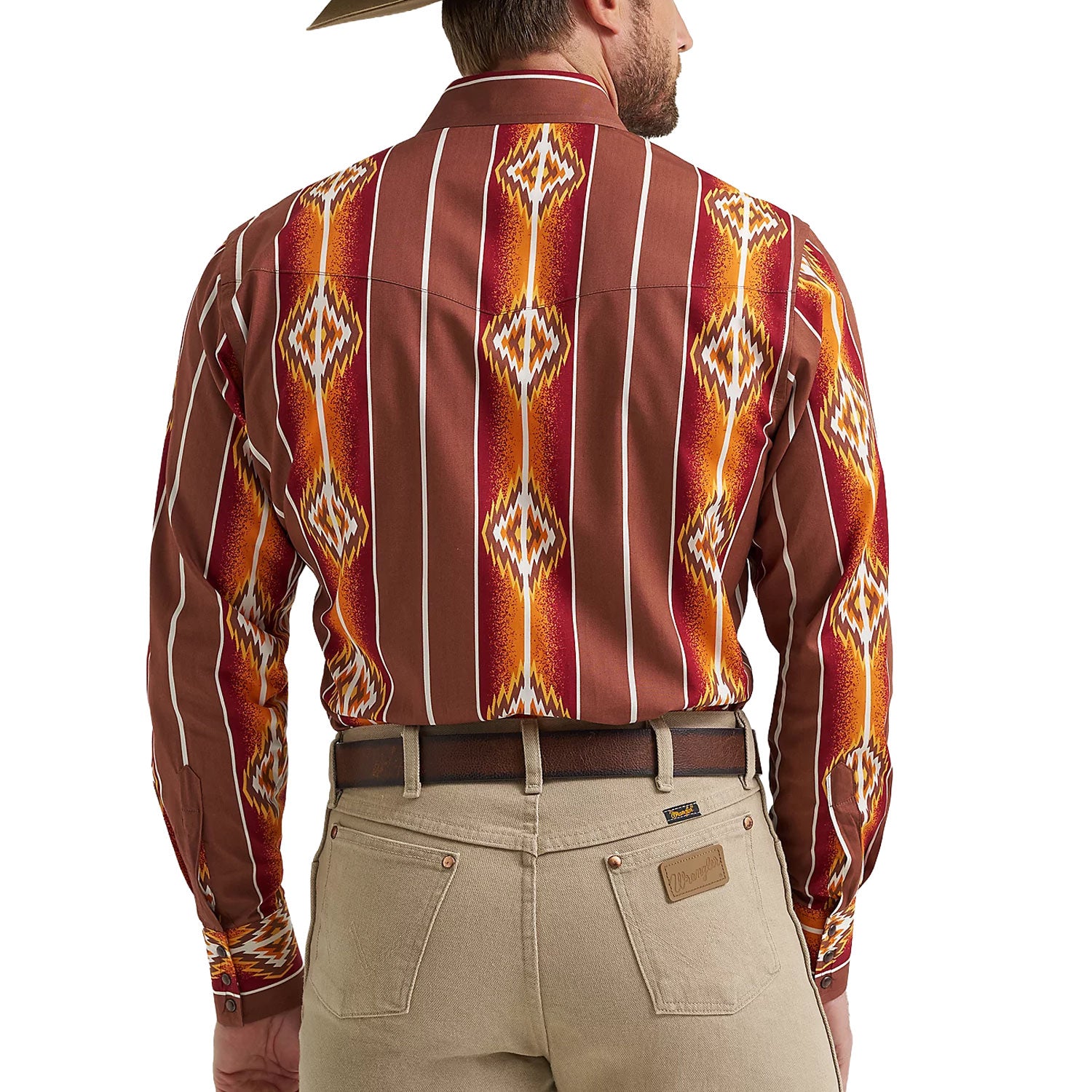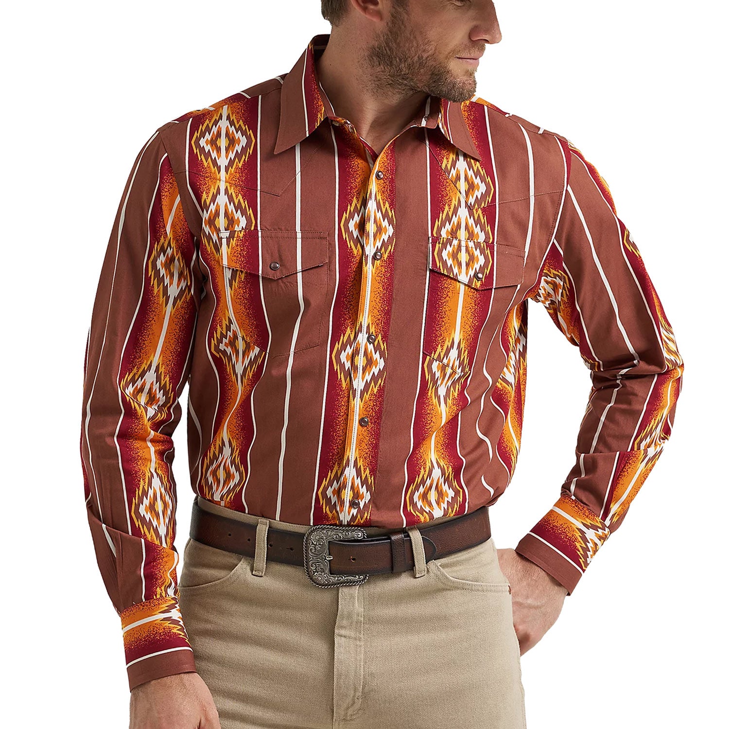 Men’s Checotah® Long Sleeve Western Snap Printed Shirt – Sunset OrangeBold, authentic, and unmistakably Western, the Checotah® shirt brings Navajo-inspired geometric prints to your everyday wardrobe. Designed for cowboys who demand both style and comfort, this long-sleeve snap shirt features a classic fit, spread collar, and authentic Western yokes for a timeless silhouette. Made from 100% cotton, it’s breathable, durable, and perfect for pairing with Wrangler Retro® or Cowboy Cut® jeans.