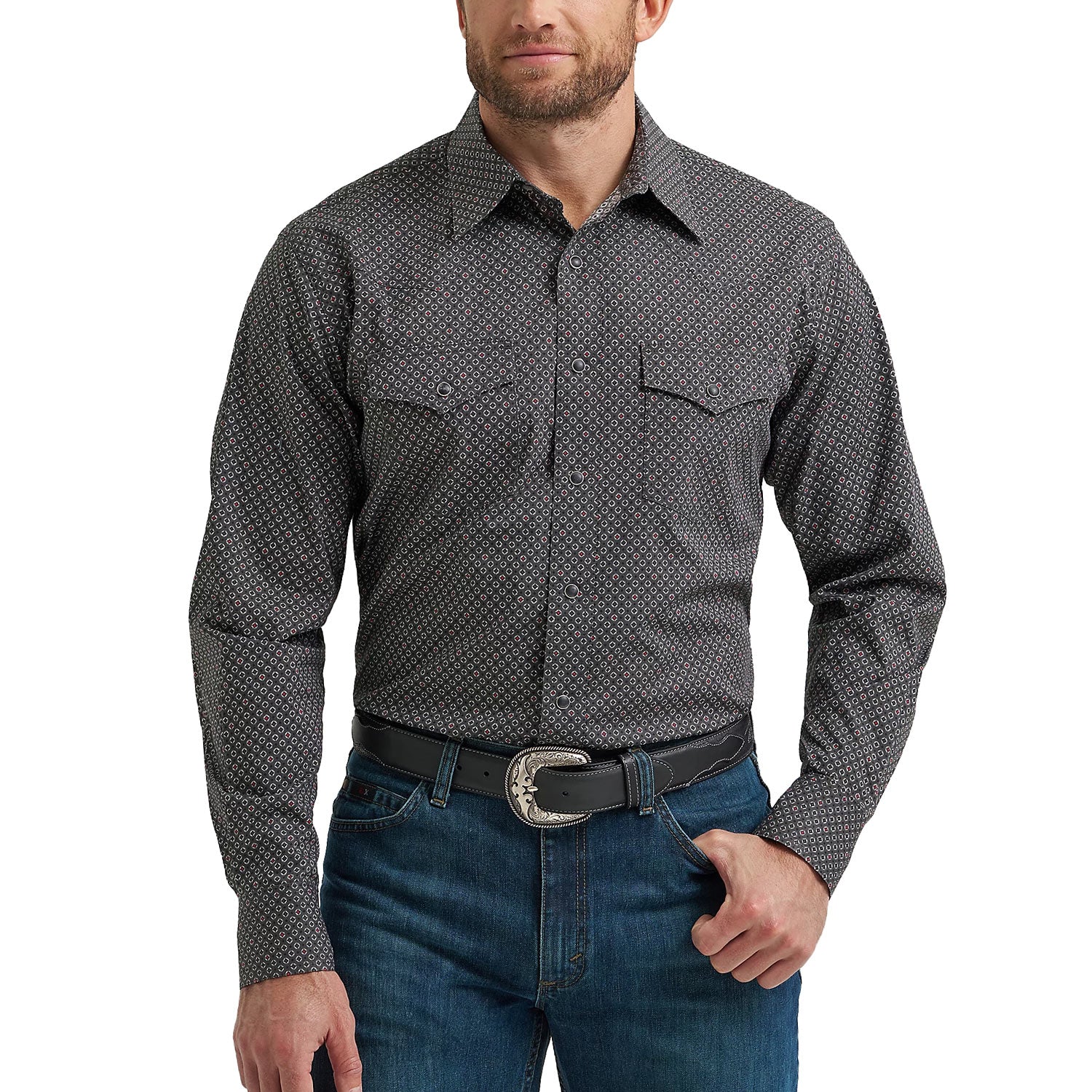 20X® Competition Advanced Comfort Long Sleeve Western Snap Shirt – Dark ShadowAuthentic comfort and style. The Wrangler 20X® Competition Advanced Comfort Snap Shirt blends classic Western design with modern performance features. Made from a cotton-spandex blend, it offers stretch and durability for everyday wear or competition. Features include a spread collar, pointed yokes, two snap flap pockets, full snap closure, and a classic fit for reliable comfort and timeless style.