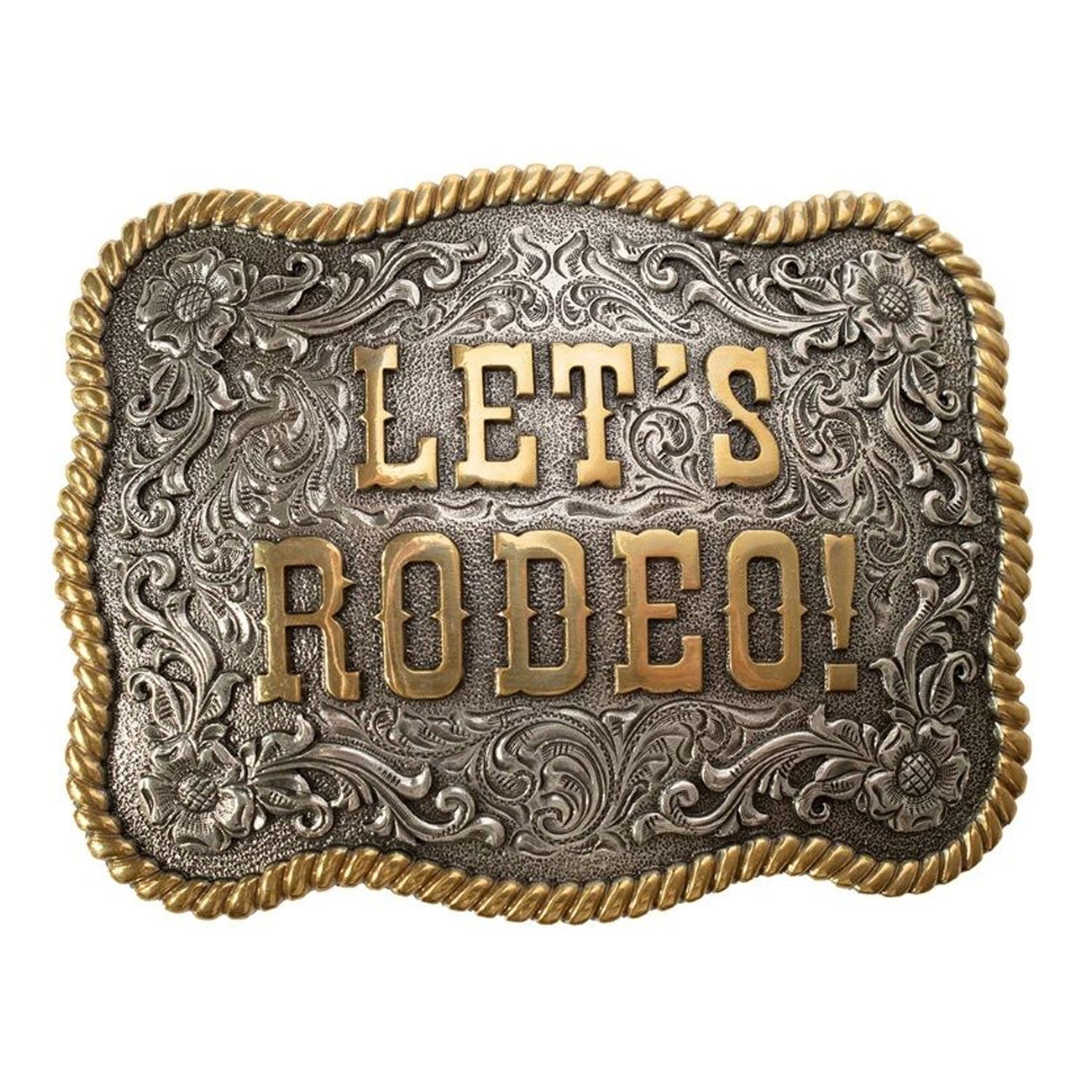 Men’s Rectangle “Let’s Rodeo” Belt BuckleCelebrate Western spirit with this Nocona men’s belt buckle. The rectangular design features “Let’s Rodeo” in antique gold at the center, set against an engraved floral and scrolling background in antique silver. Scalloped edges with an antique gold rope border complete the striking, classic Western look.