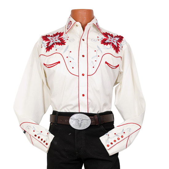 Ivory western snap shirt with red floral embroidery design on front and back, red piping trim detail.