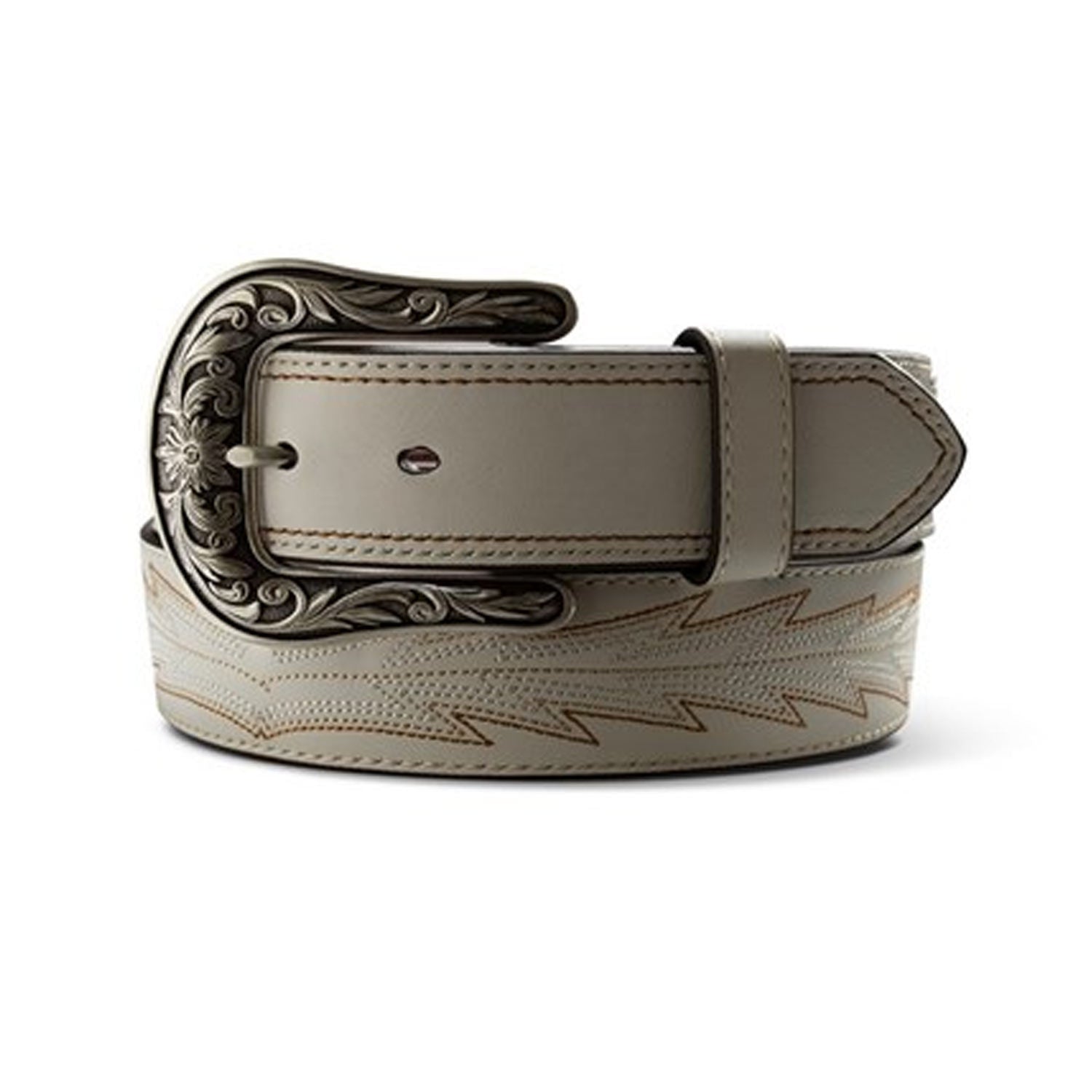 Ladies 1 1/2" Casanova Belt – WhiteFrom Ariat’s Casanova collection, this ladies belt combines classic Western style with elegant detailing. Crafted from 100% genuine leather, it features white and brown embroidered boot stitching along the strap, flame billets with matching embroidery around the edges, and an embossed Ariat shield on the buckle end. The antique silver floral buckle completes the refined look.