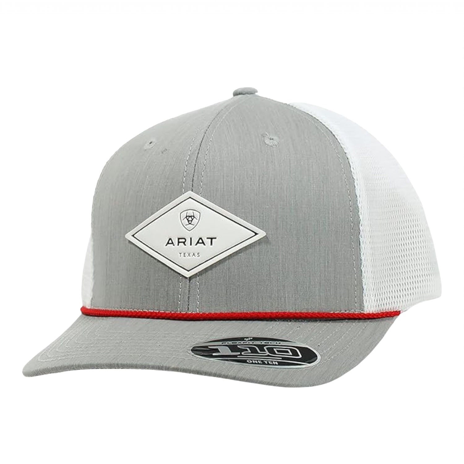 Classic and modern details come together in this Ariat men’s Flexfit 110 cap. Featuring a grey front with a diamond Ariat logo and a bold red rope accent along the bill, this structured six-panel cap is finished with a white mesh back and snapback closure for a comfortable, adjustable fit.