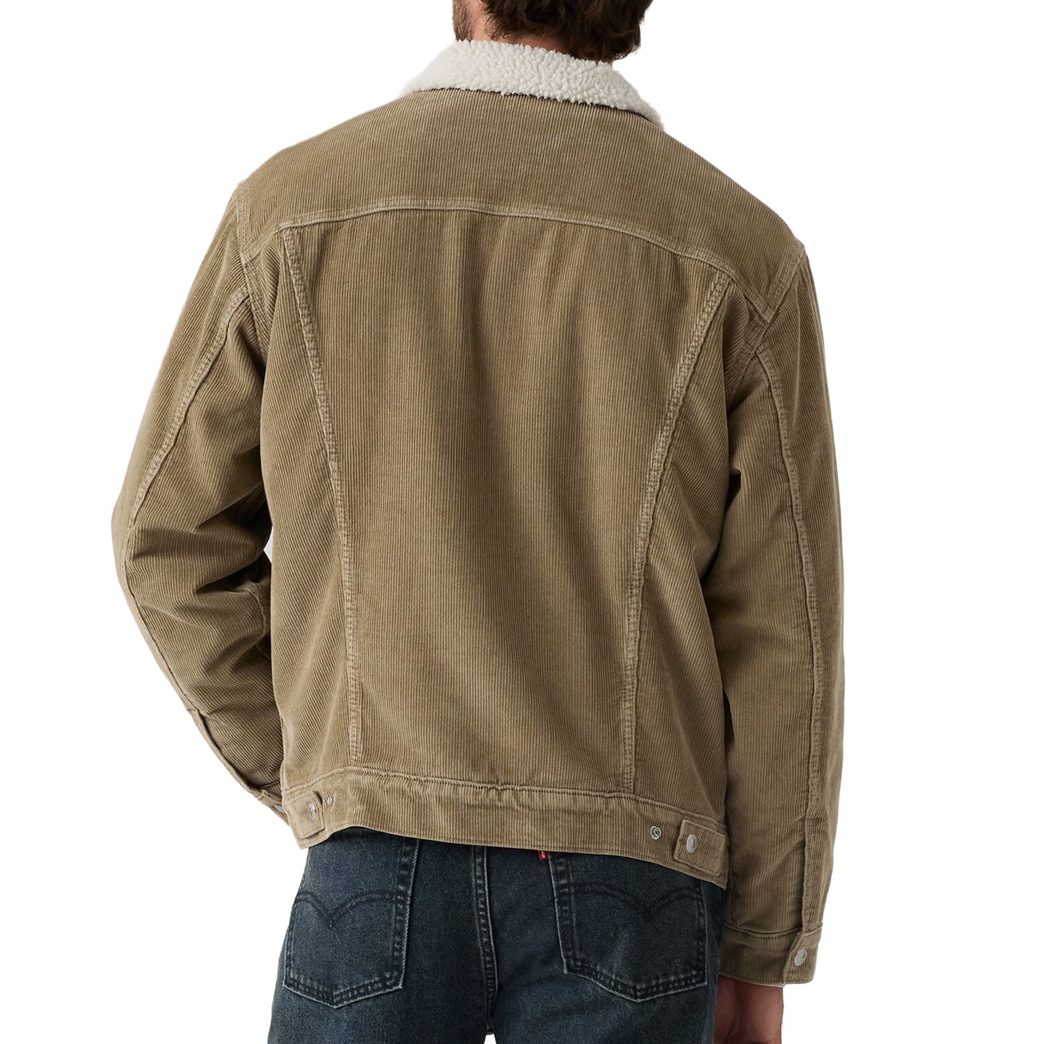 Long Sleeve Relaxed Fit Corduroy Sherpa Trucker Jacket – Timber WolfStay warm in classic Levi’s style with this Relaxed Fit Corduroy Sherpa Trucker Jacket. Featuring a soft faux-sherpa collar and lining, this jacket pairs a cozy interior with a durable 100% cotton corduroy exterior. Designed for layering, it offers a relaxed fit and the iconic Type III Trucker silhouette, complete with metal buttons, chest flap pockets, hand pockets, and an interior pocket for utility.