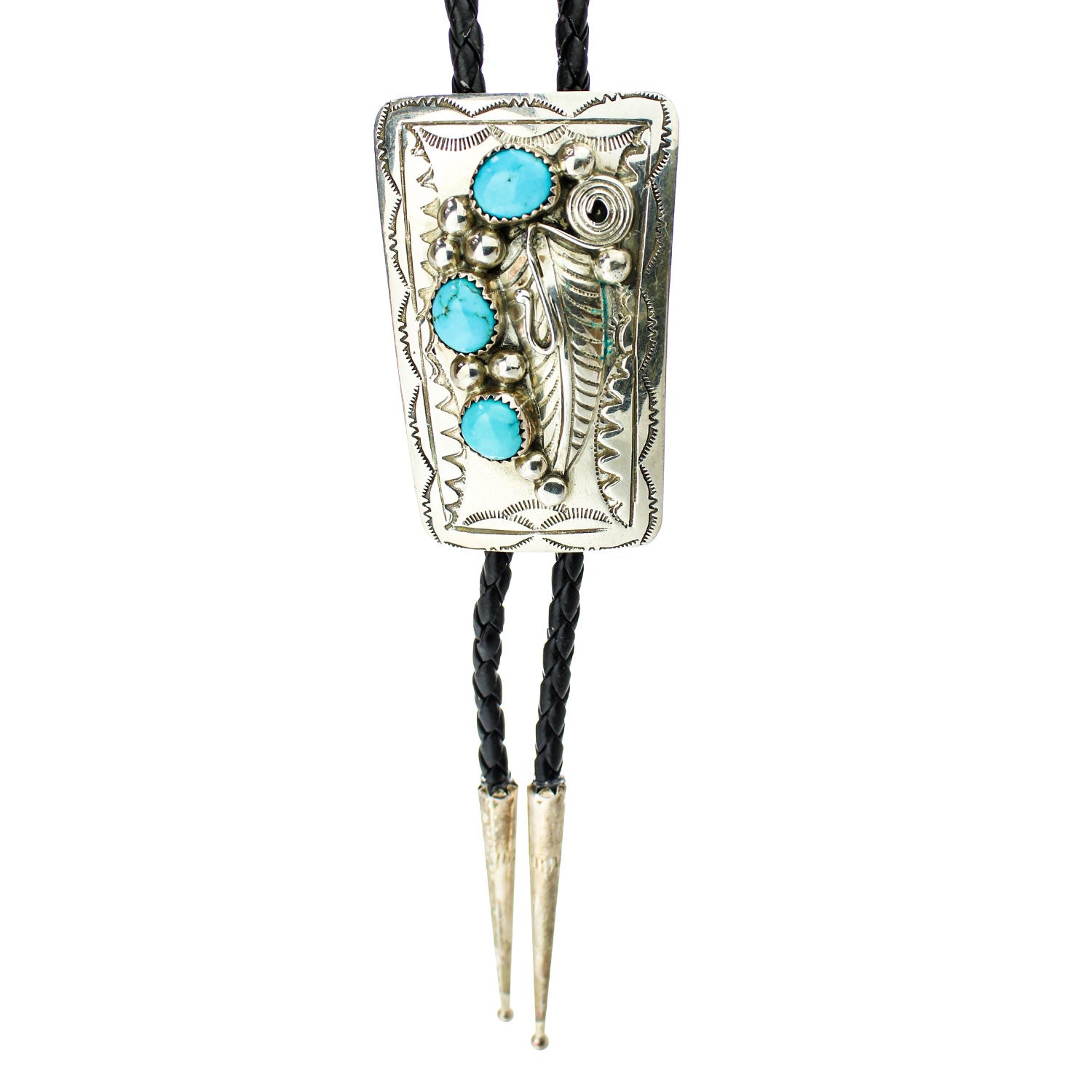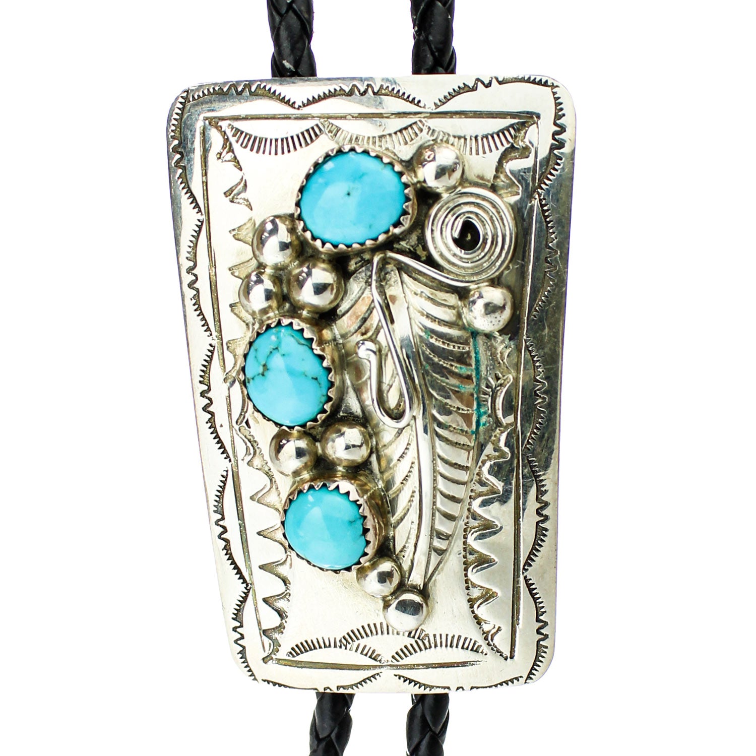 A classic Southwestern statement piece, this sterling silver bolo tie features intricate Navajo-style silverwork and three vibrant turquoise stones set in raised bezels. The genuine silver rectangle centerpiece is beautifully detailed with applied wire designs, paired with silver tips and a black adjustable cord for a comfortable, customized fit.