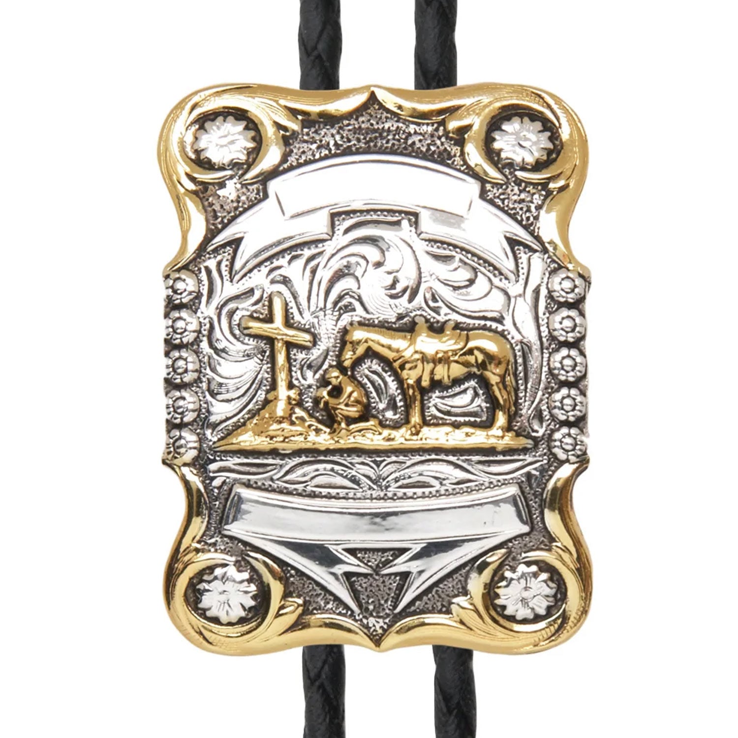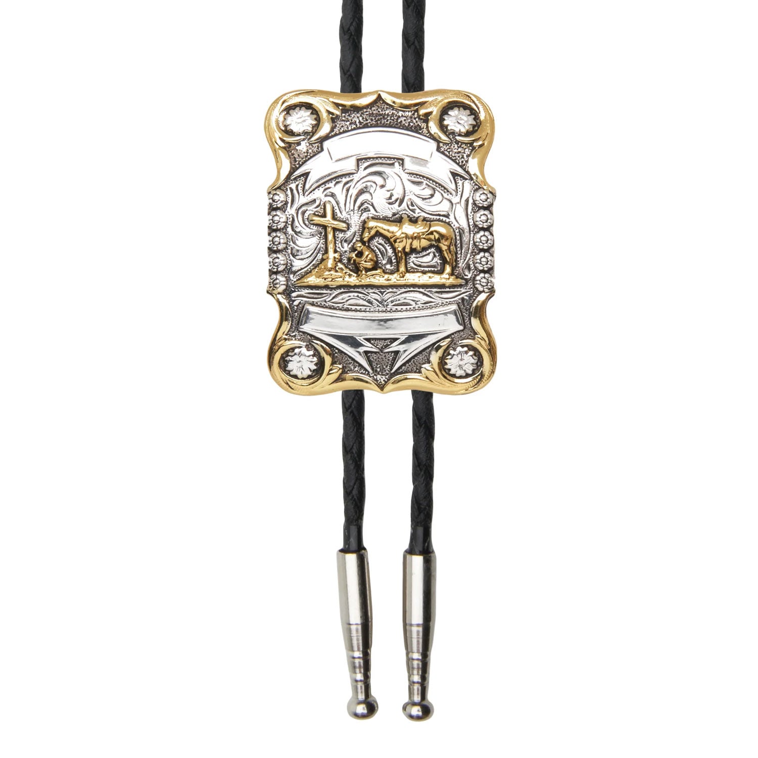 Scalloped Praying Cowboy Bolo TieThis And West bolo tie features a scalloped rectangle medallion depicting a praying cowboy in antique gold and silver tones. Paired with a 36" black braided leather cord and silver tips, it’s a classic Western accessory that highlights traditional Southwestern craftsmanship.
