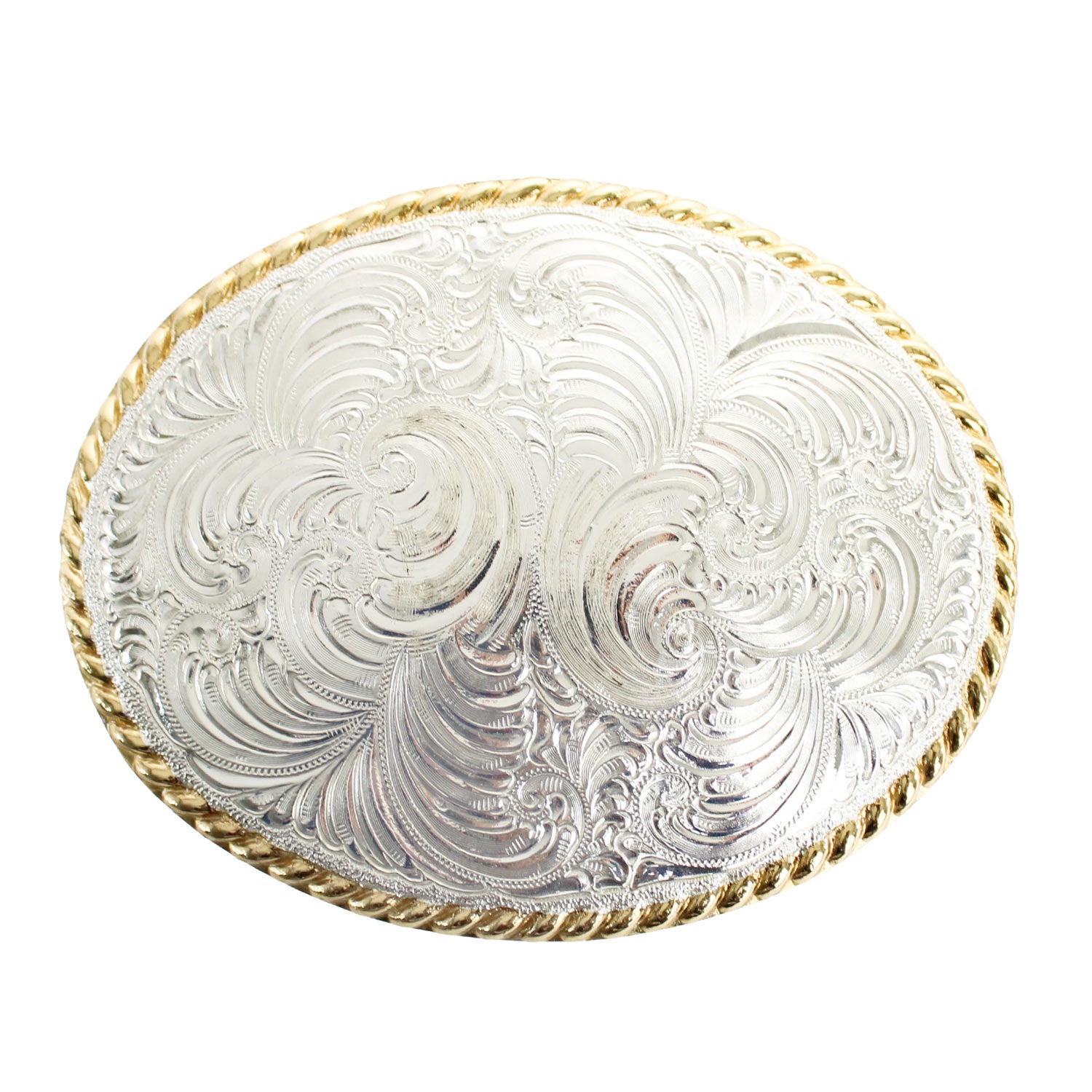 Silver Leaf Scroll Belt BuckleAdd timeless Western elegance to your outfit with this hand-engraved Crumrine buckle, featuring a silver leaf scroll pattern wrapped in a gold rope design.