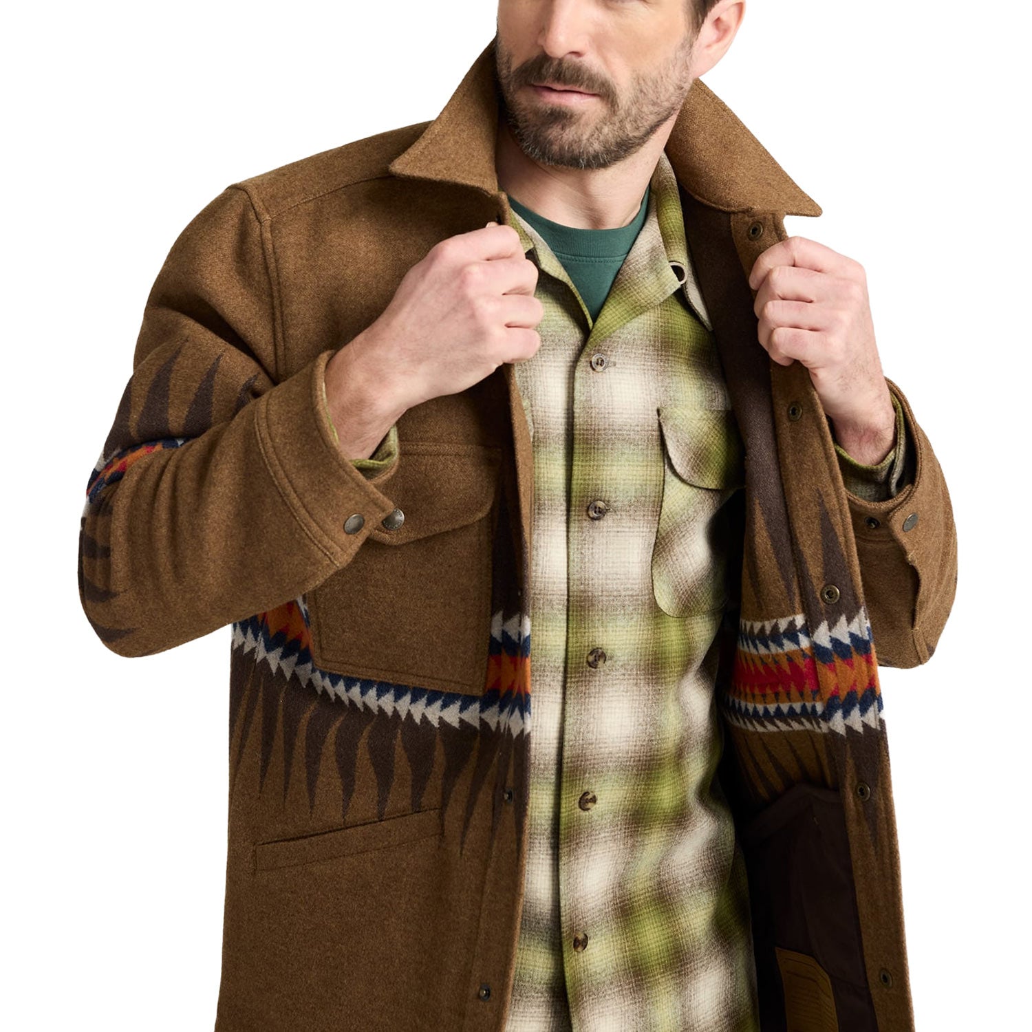 Men’s Sawtooth Ridge Wool Field JacketA rugged, heritage-inspired field jacket crafted from warm wool and finished with a vintage Pendleton-exclusive pattern that flows across the body and sleeves. Designed with functional details inspired by early hunting jackets, this piece delivers warmth and timeless outdoor style.