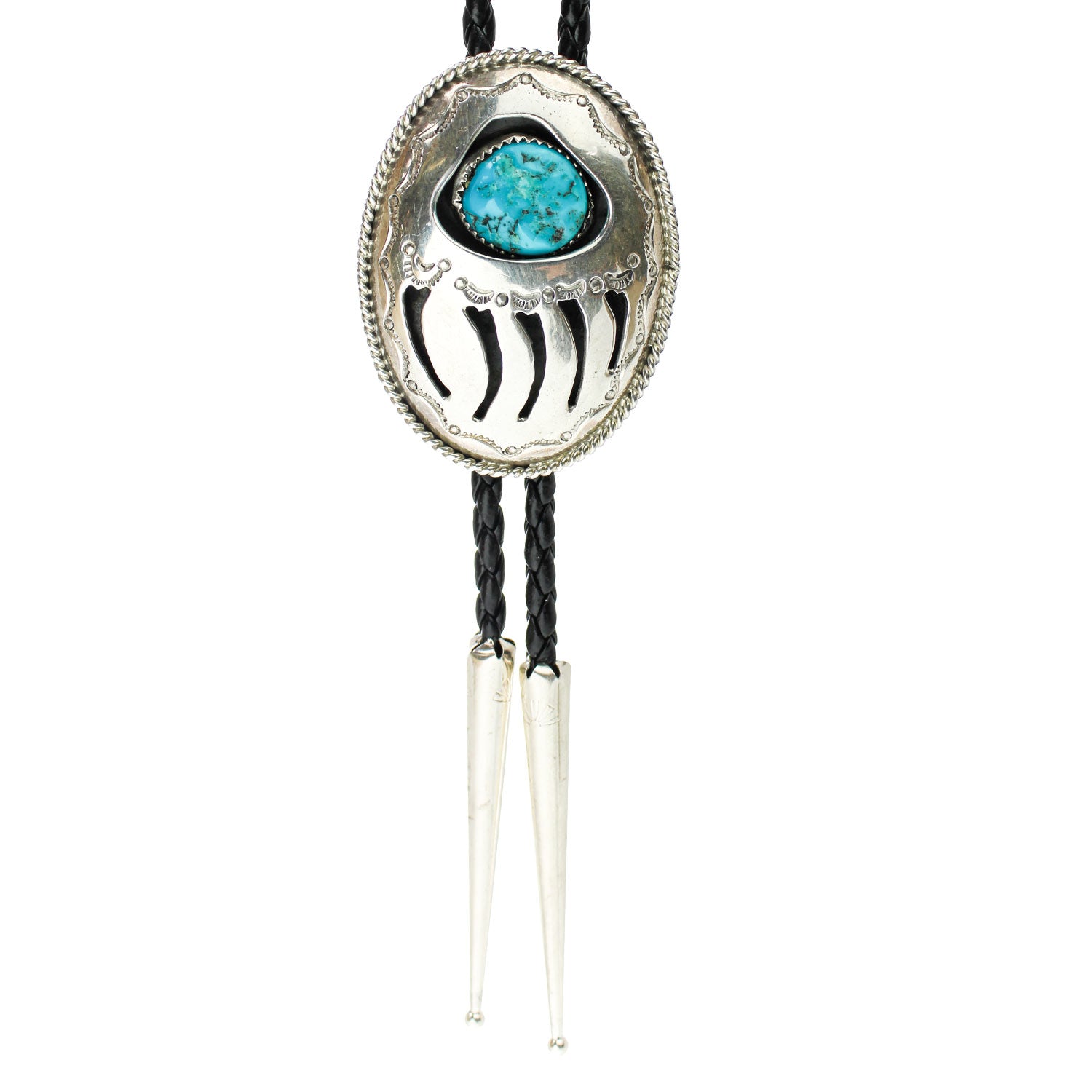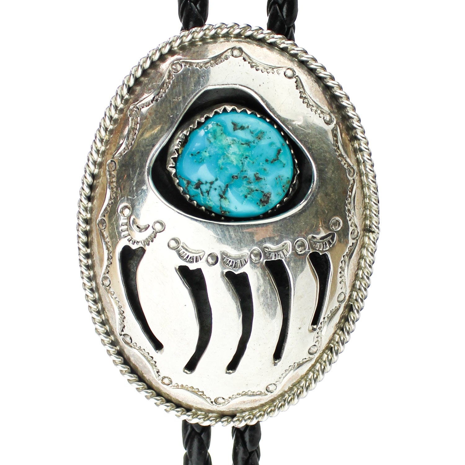 Turquoise Stone Bear Claw Bolo TiePowerful symbolism meets handcrafted Southwestern artistry in this striking bear claw bolo tie, designed to make a bold yet refined Western statement.