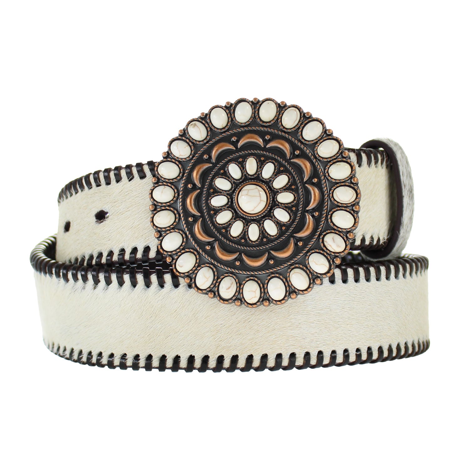 •Buckle: Copper circular buckle adorned with white stones