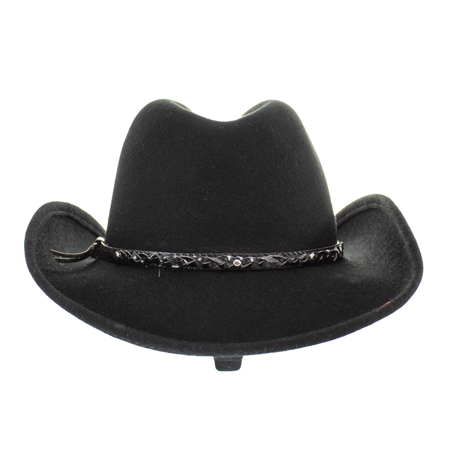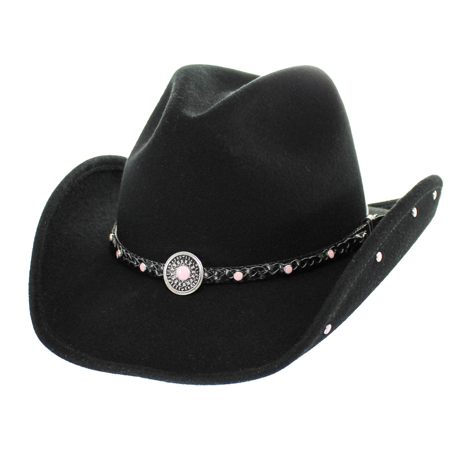 The Baby Jane cowgirl hat from Bullhide is playful, stylish, and made just for little cowgirls with big personality. Crafted from soft black wool felt, this youth-sized hat mirrors classic Western style while adding fun, feminine details that make it extra special. A braided leather hatband with pink bead accents, a pink-detailed center concho, and silver-tone studs along the underbrim give it standout charm without feeling too grown-up. With a shapeable brim and comfortable fit, the Baby Jane is perfect for rodeos, dress-up days, or everyday cowgirl adventures.
