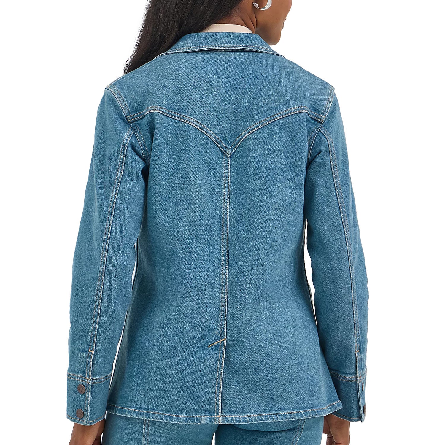 Women’s Retro Denim Blazer – Light DenimPower suiting the Western way. The Wrangler Retro Denim Blazer blends classic cowgirl charm with a polished, modern silhouette. Crafted from midweight cotton denim with a touch of stretch, it offers all-day comfort without sacrificing style. The vintage-inspired cut features a dramatic notched collar, button-up front, single-point yokes, flat-felled seams, and welt flap pockets with snaps for that signature Wrangler finish.