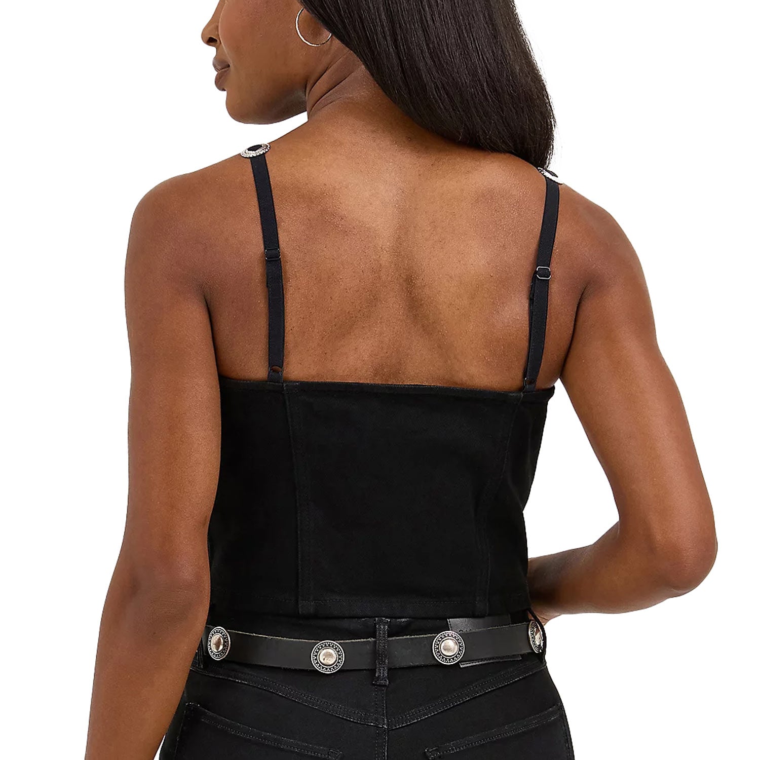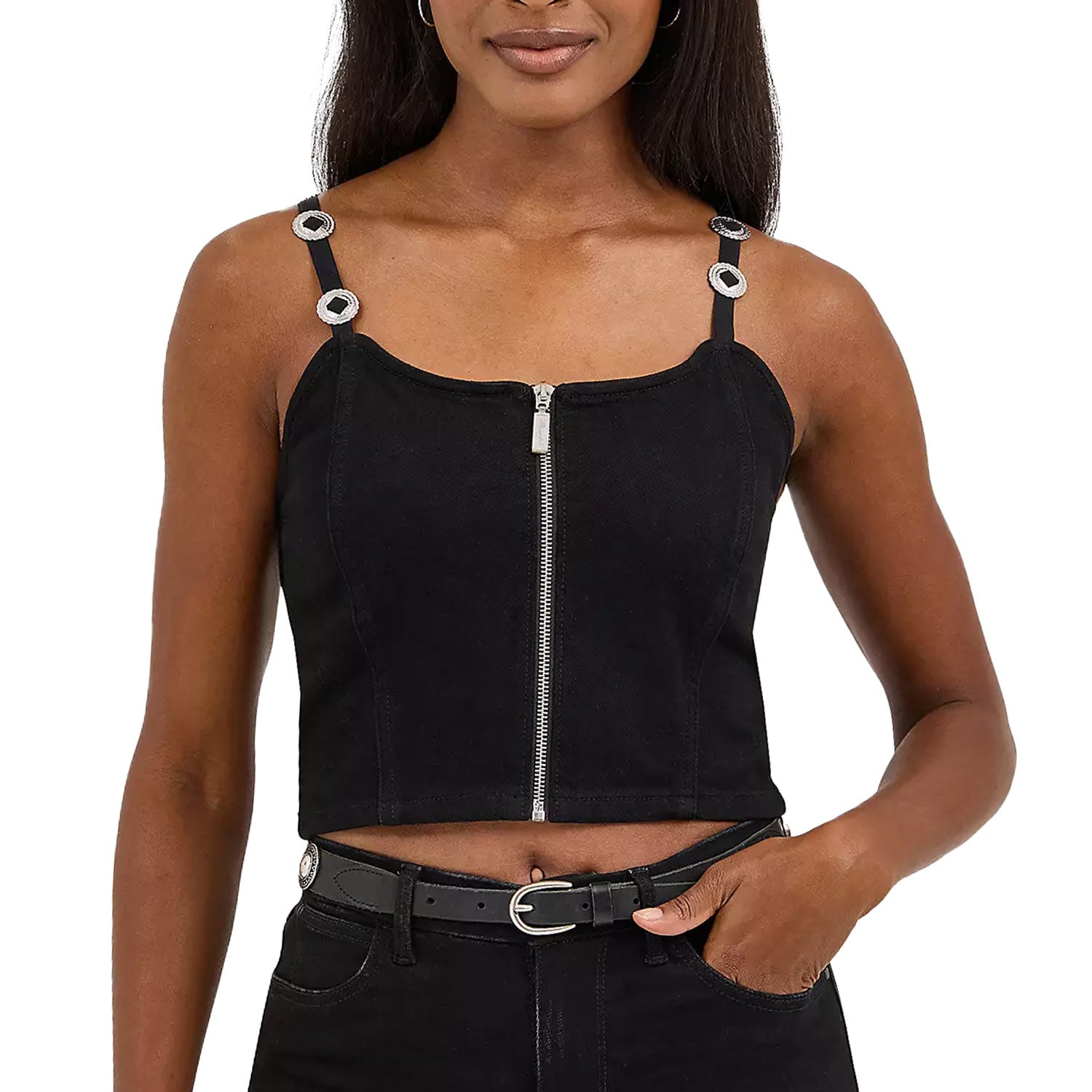 Women’s Concho Strap Denim Tank – BlackBold and unapologetically Western, the Wrangler Concho Strap Denim Tank delivers cowgirl attitude with a modern edge. Crafted from cotton with a touch of stretch, this cropped tank offers a slim, flattering fit with comfortable flexibility. A zip-front closure adds a contemporary touch, while shiny concho strap details bring standout Western flair—no extra accessories needed. Finished with a scoop neckline, this sleeveless style is made to turn heads wherever you go.