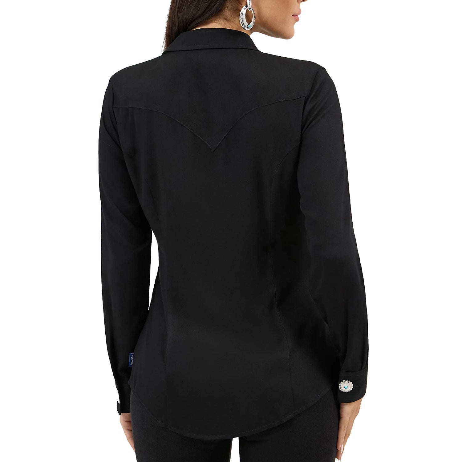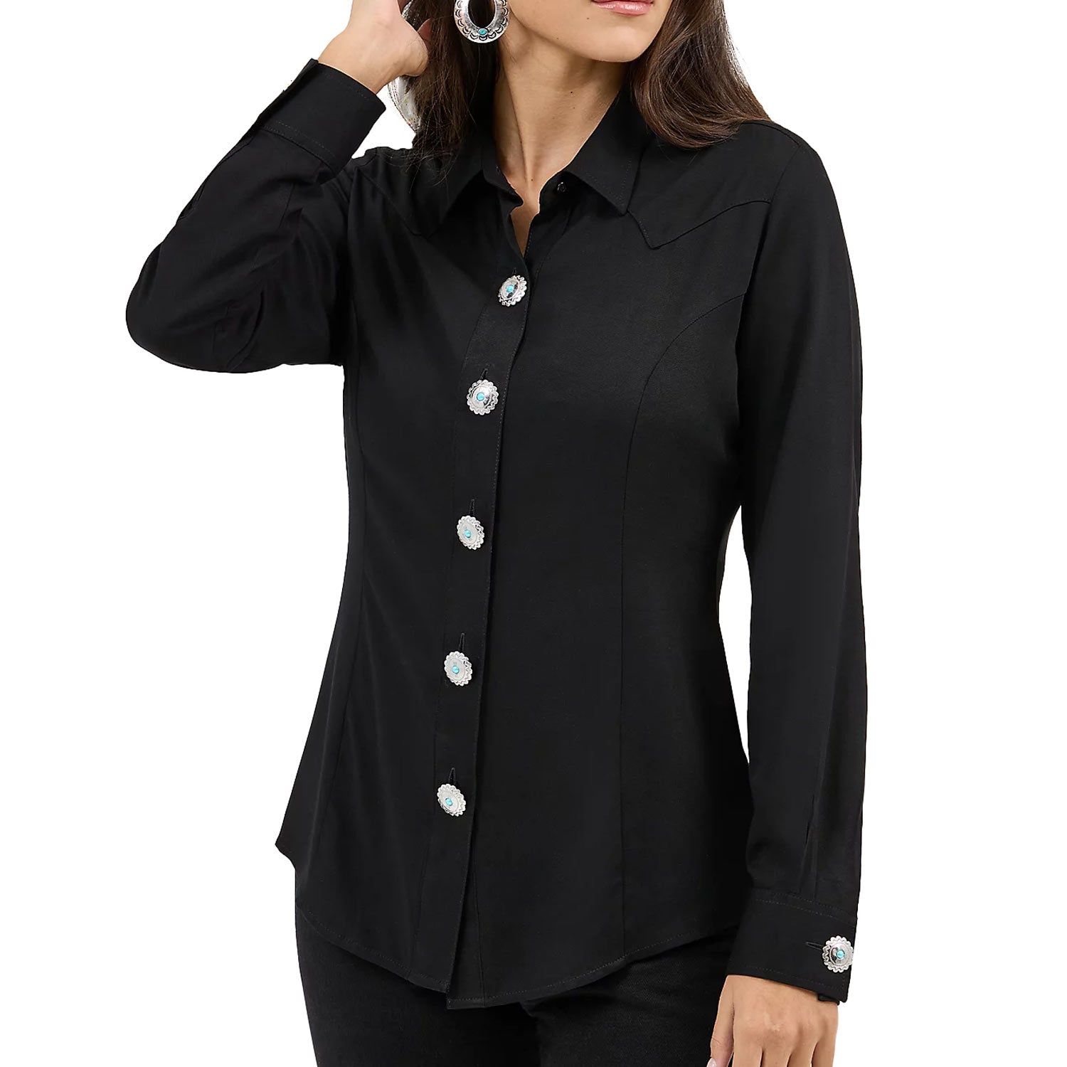 Women’s Slim Concho Button Shirt – BlackSometimes the details say it all. The Wrangler Women’s Slim Concho Button Shirt delivers iconic Western style with eye-catching concho buttons featuring turquoise-colored stone inserts—no extra accessories needed. Crafted from a soft, silky viscose fabric, this shirt offers a refined drape and all-day comfort. Single-point yokes front and back, a spread collar, and a slim silhouette create a clean, flattering look that works tucked or untucked for effortless styling.