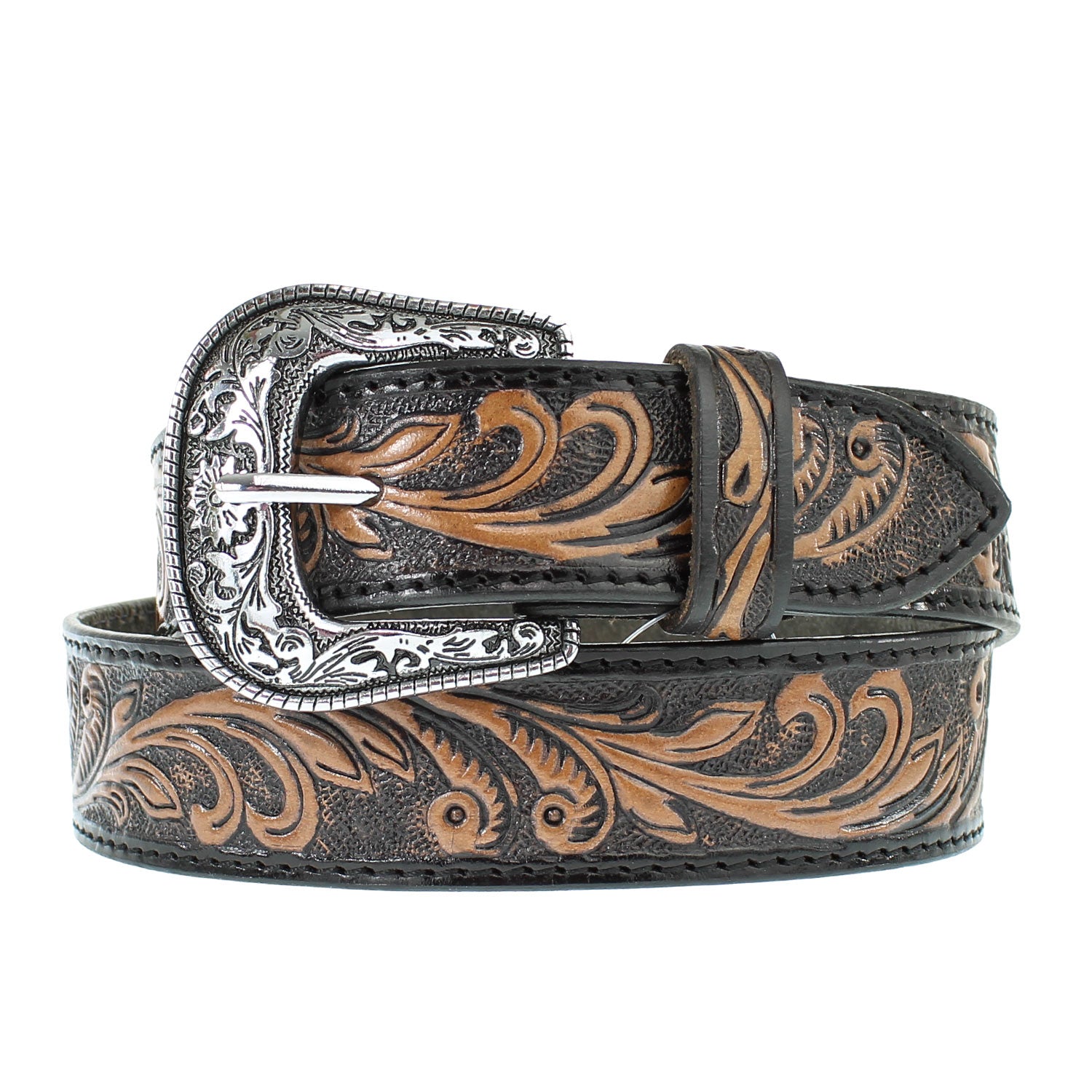 204 Black Western Leather BeltA classic Western essential, this belt features a beautifully detailed tooled leather strap in black and tan tones, finished with an engraved silver buckle for timeless cowboy style.