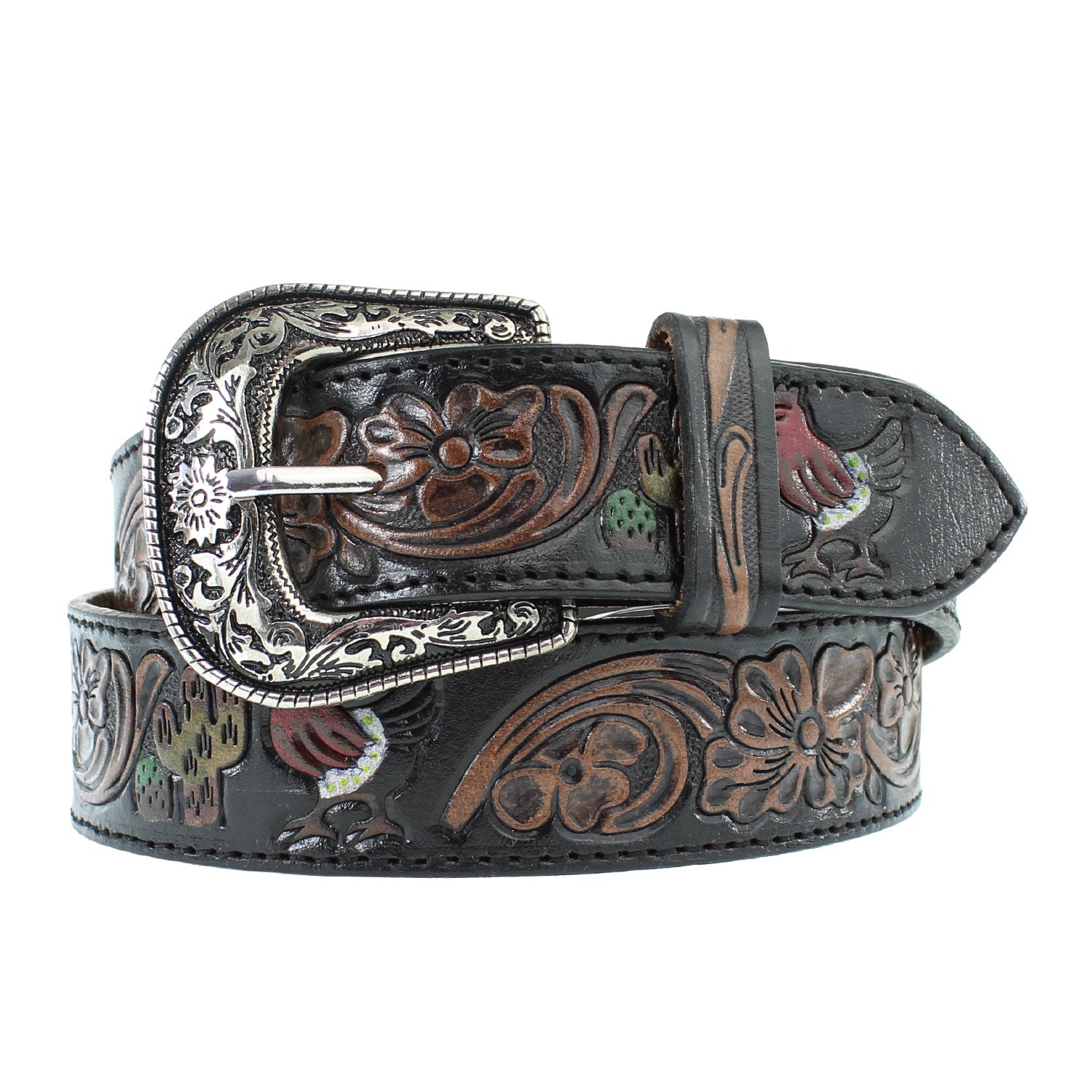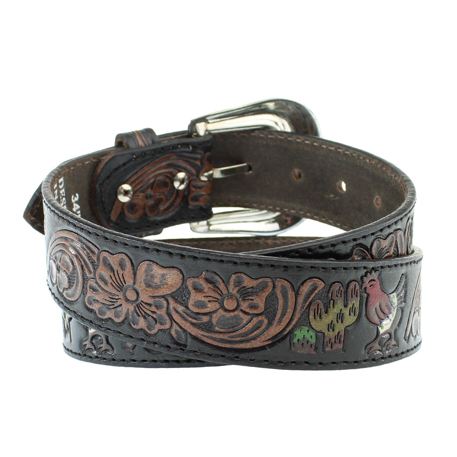 216 Rooster Design Leather BeltA classic Western essential, this belt features a beautifully detailed brown floral-tooled and rooster motif design on a black leather strap, finished with an engraved silver buckle for timeless cowboy style.