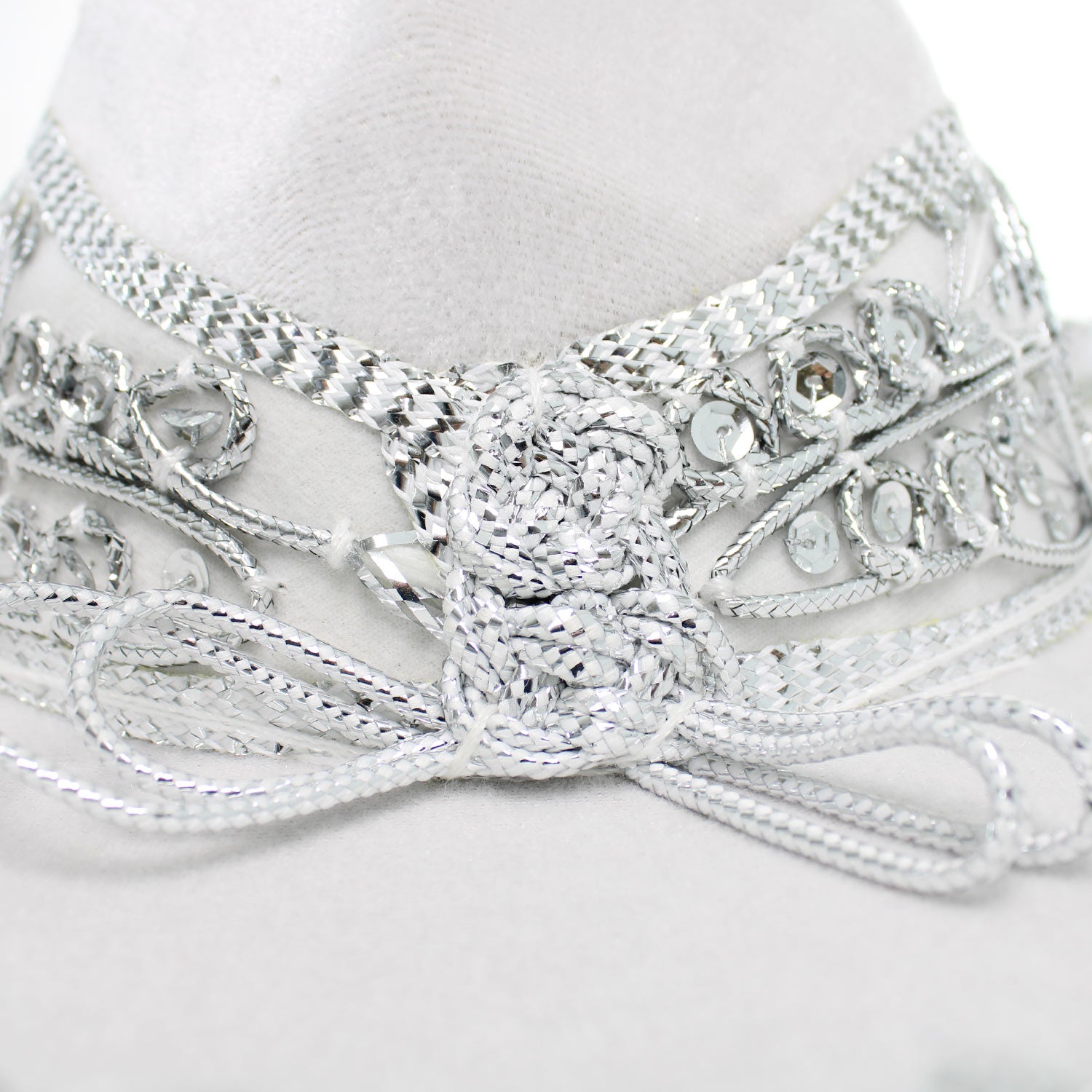 71176 White Charro Children’s HatThis beautifully crafted children’s charro hat celebrates traditional Mexican heritage with elegant detail and artisan craftsmanship. Made with velvet and fine metallic thread, it features intricate hand-embroidered floral patterns accented by silver trim. The classic charro sombrero silhouette makes it a standout cultural piece, perfect for celebrations, performances, or special occasions. Each hat reflects the pride and skill of Mexican artisans, offering both tradition and quality in a timeless design.
