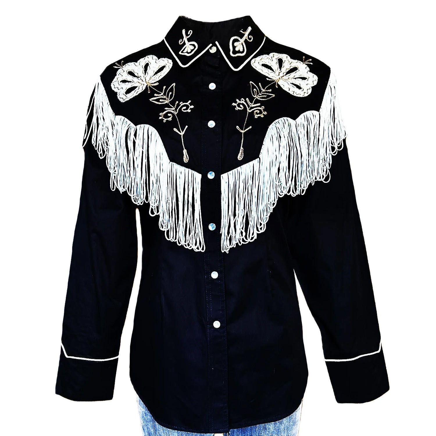 7723 Black with White Fringe Embroidered Western BlouseBold, iconic, and unmistakably Western, this Rockmount Ranchwear fringe blouse is not for the timid. Inspired by a classic 1940s design, it features genuine hand chenille embroidery on premium cotton gabardine twill. Dramatic fringe accents flow across the front, back, and sleeves, echoing traditional Western and Native American influences where fringe served both style and function. Designed with a tapered fit and darts at the front and back, this blouse delivers a flattering silhouette while staying true to vintage Western heritage.
