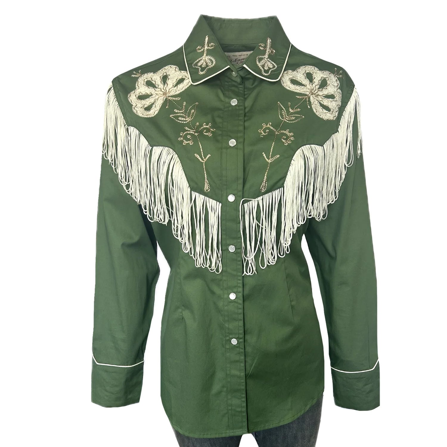 Bold, iconic, and unmistakably Western, this Rockmount Ranchwear fringe blouse is not for the timid. Inspired by a classic 1940s design, it features genuine hand chenille embroidery on premium cotton gabardine twill. Dramatic fringe accents flow across the front, back, and sleeves, echoing traditional Western and Native American influences where fringe served both style and function. Designed with a tapered fit and darts at the front and back, this blouse delivers a flattering silhouette while staying true to vintage Western heritage.