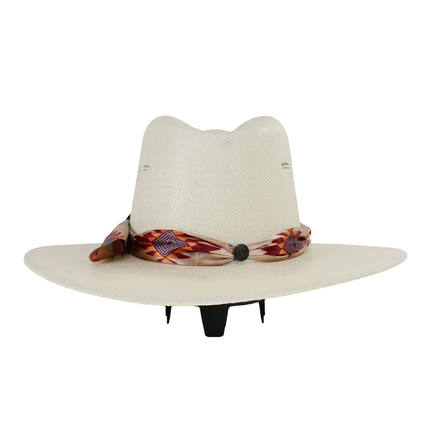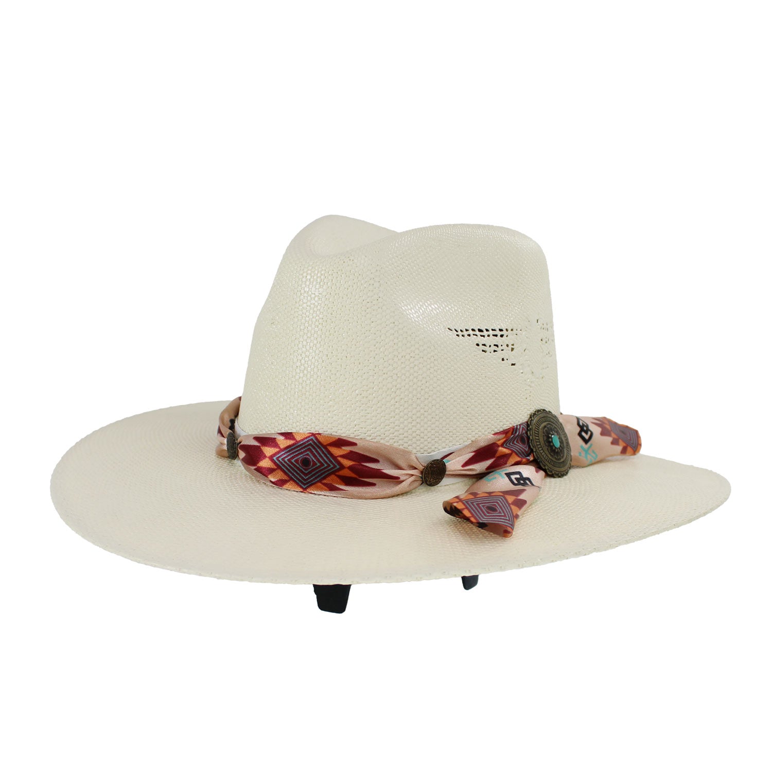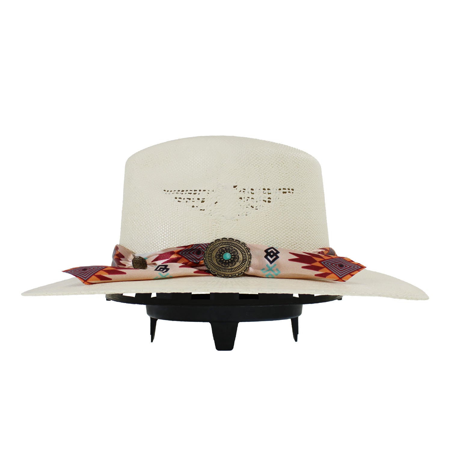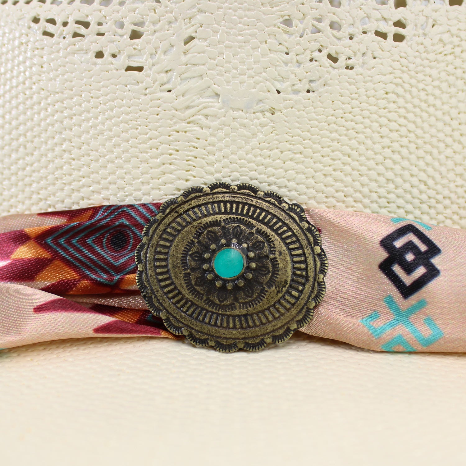 Adventure-ready style meets traditional artistry in the **Stone Explorer Taiwan Straw Hat**. Crafted from natural straw, this flat-brim hat blends comfort and craftsmanship with a distinctive Southwestern flair. Its 4 1/8" pinchfront crown and 3 1/2" brim create a bold, modern silhouette, while the woven construction keeps it lightweight and breathable. The fabric hatband showcases Navajo-inspired patterns in vibrant colors, accented with metallic conchos and a striking turquoise-centered concho on the right side—adding a touch of Western sophistication to every outing.