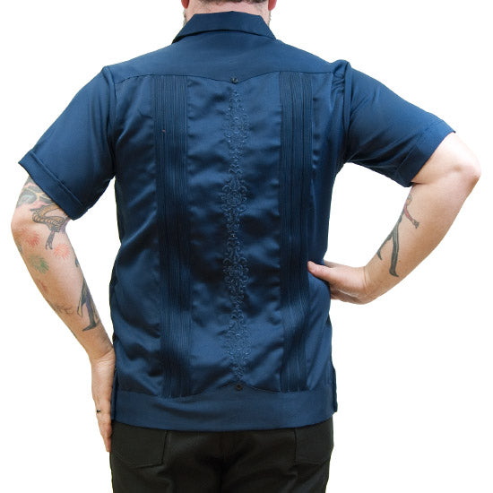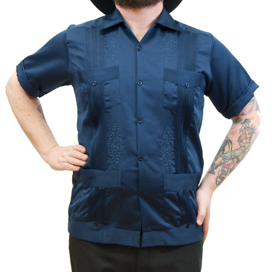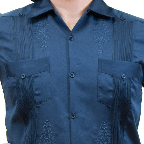 Men's Navy Stitch GuayaberaA refined take on a traditional classic, this guayabera features elegant navy stitching and timeless details. With its four-pocket design, pleated front and back, and multiple decorative buttons, it offers both style and comfort for any occasion.