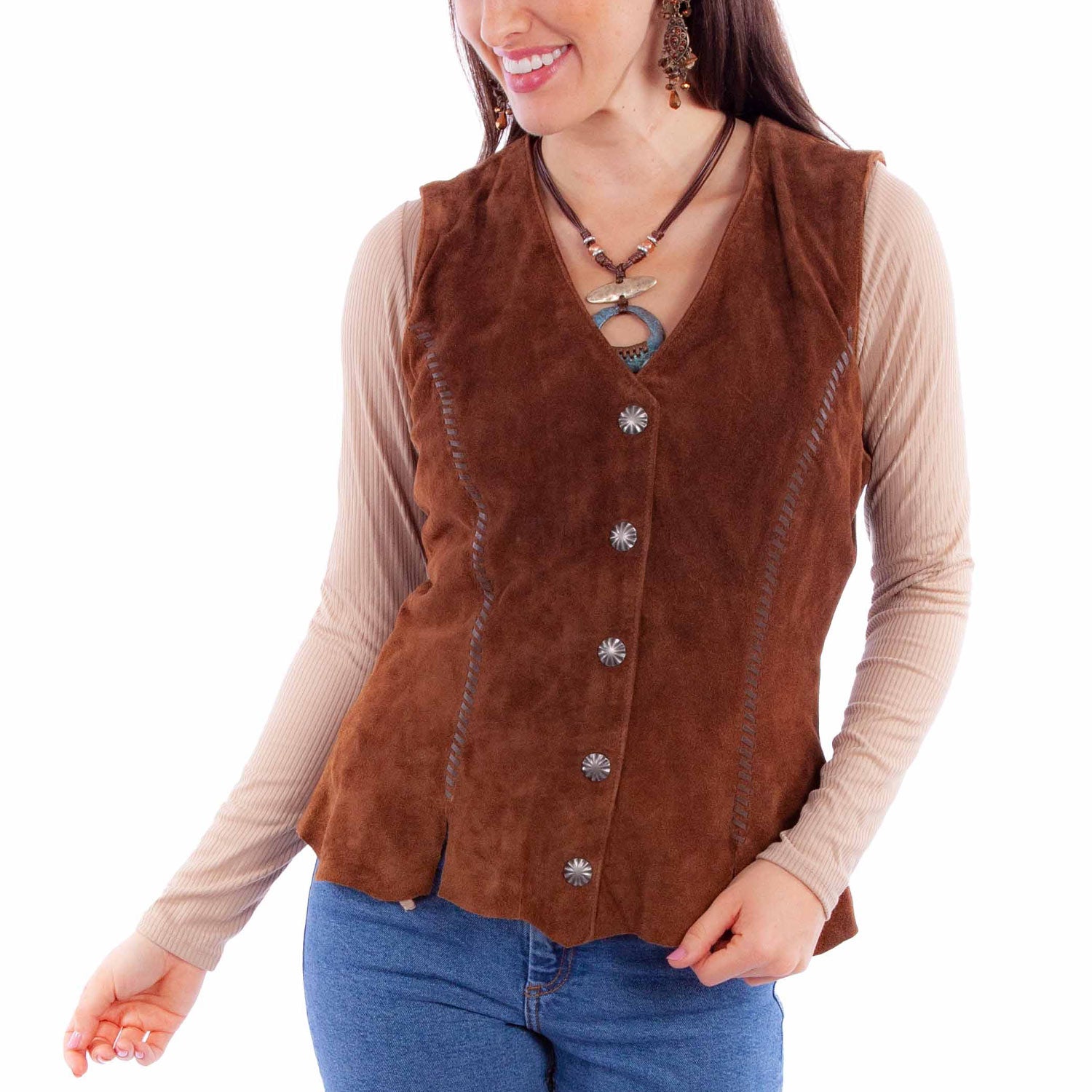 Suede Concho Button Vest – A classic western vest that blends rustic charm with refined feminine style.• Crafted from soft suede for a smooth, luxurious texture