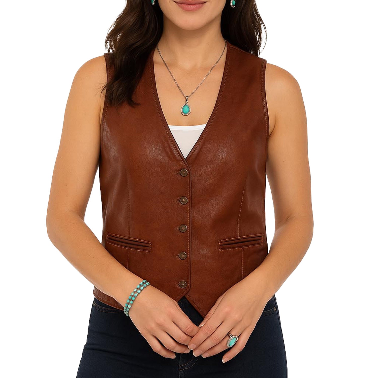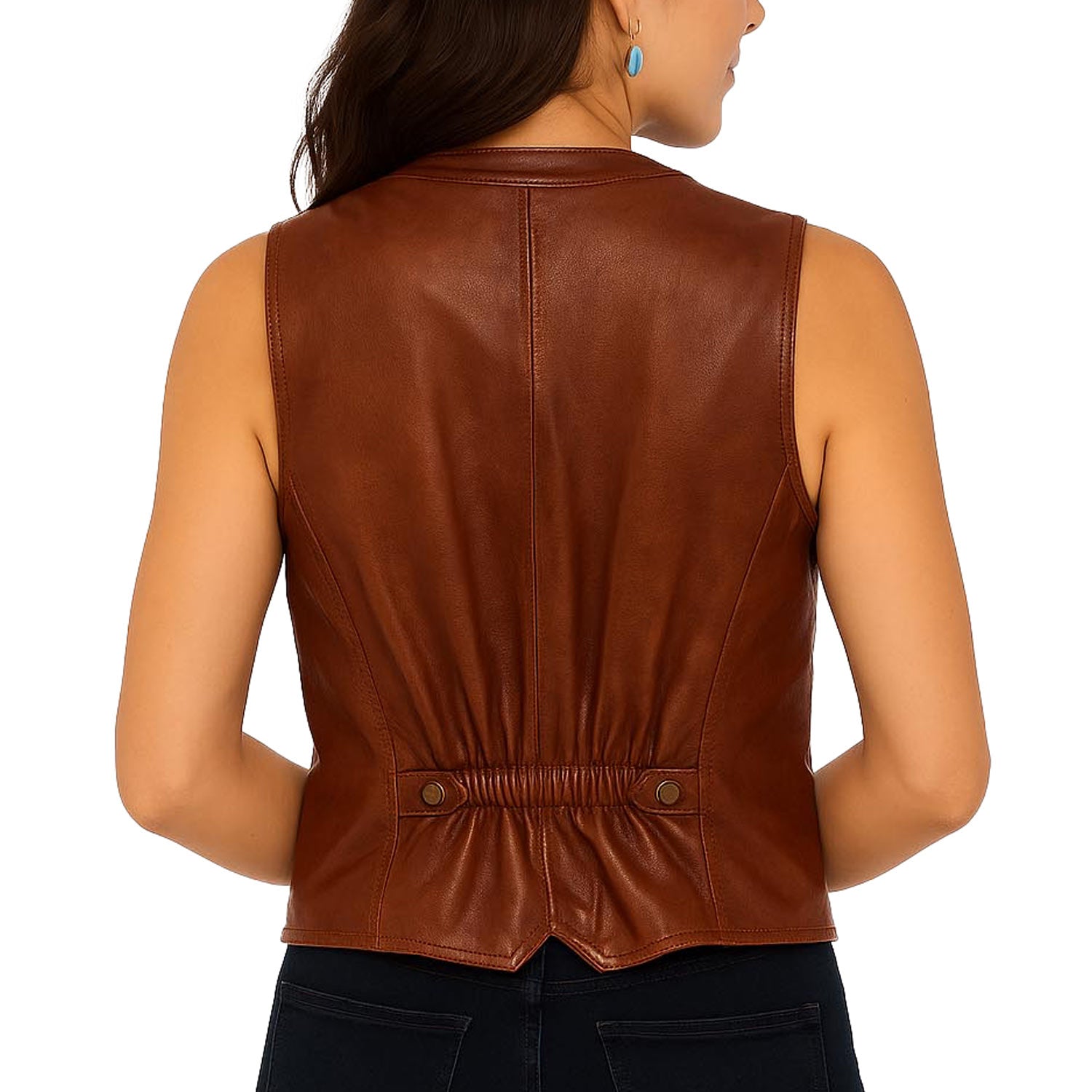 Cognac Soft Lamb Ladies Vest – A refined western piece combining elegance and comfort, perfect for any occasion.• Crafted from premium lamb leather and lined with soft floral polyester