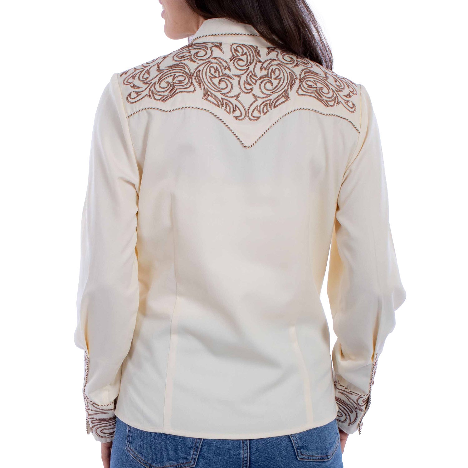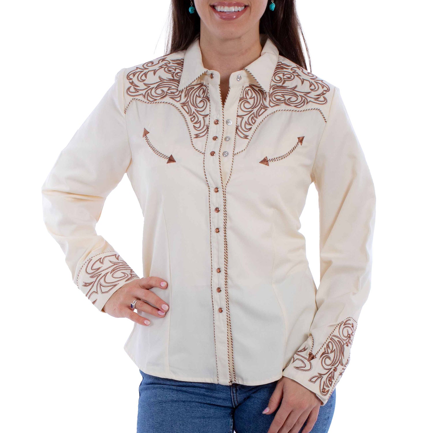 Ladies Embroidered Scroll Top – A graceful western blouse that blends elegance with classic charm.• Cream poly/rayon blend for a soft feel and comfortable fit