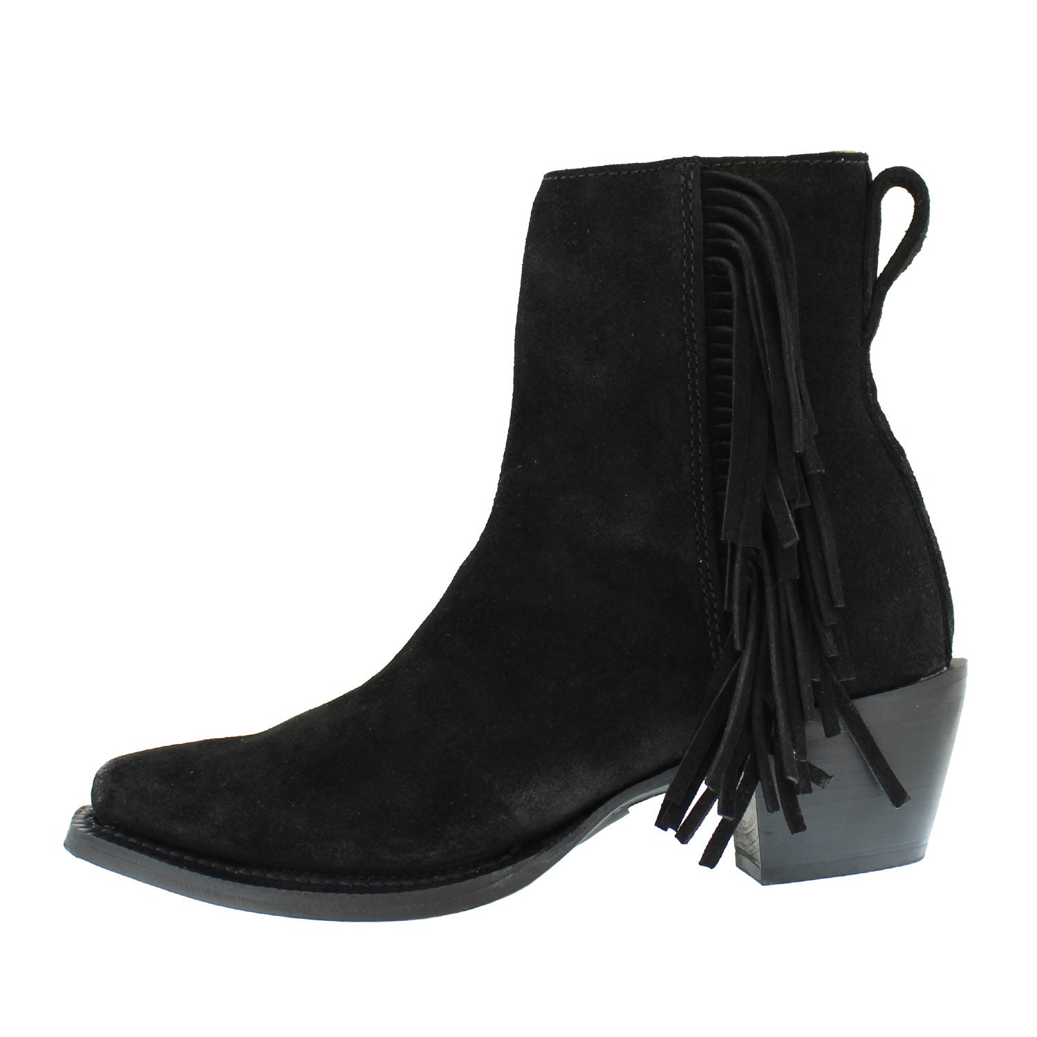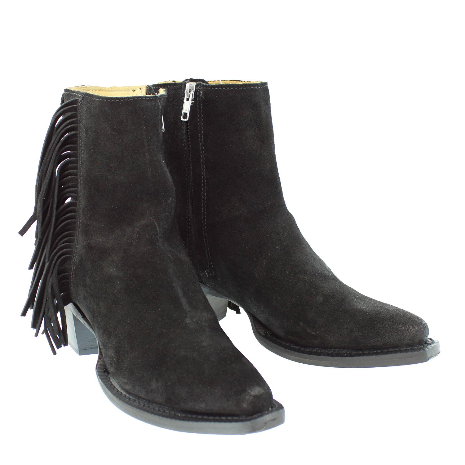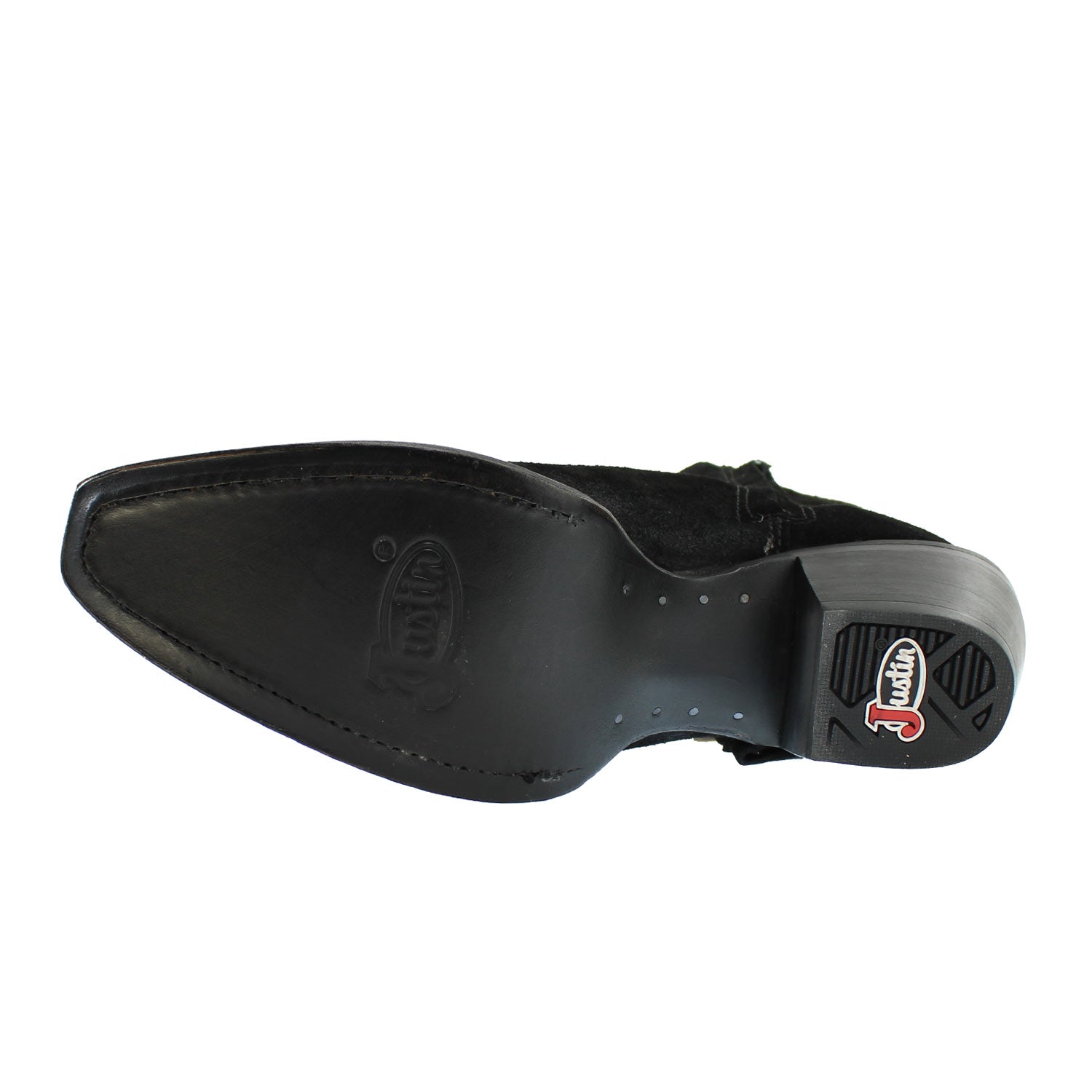 BEV Bootie Fringe with a Western Edge Step out in modern Western style with the Justin BEV Bootie! Featuring a sleek suede vamp and playful fringe along the side, this ankle boot pairs classic cowboy-inspired details—like a snip toe and 1 5/8" underslung cowboy heel—with versatile style perfect for jeans, skirts, or dresses. The J-Flex Comfort System® insole, leather lining, and 3/4 welt construction ensure lasting comfort and durability.•Material: Suede vamp